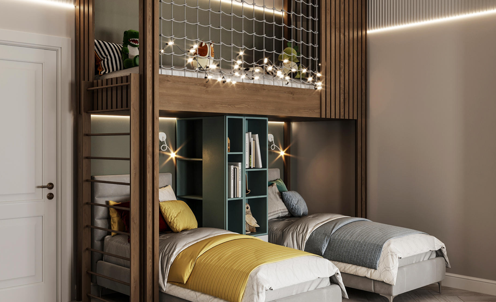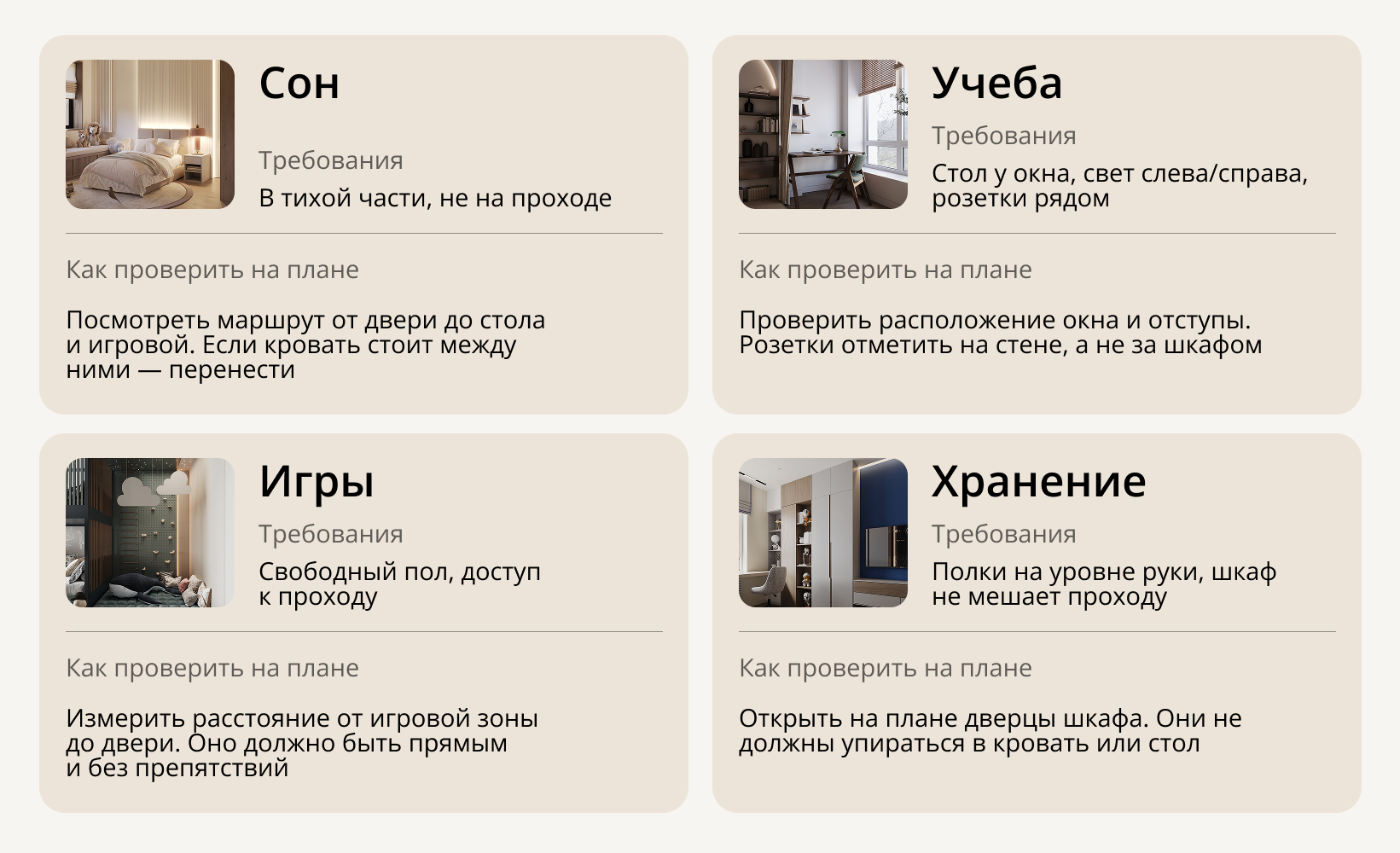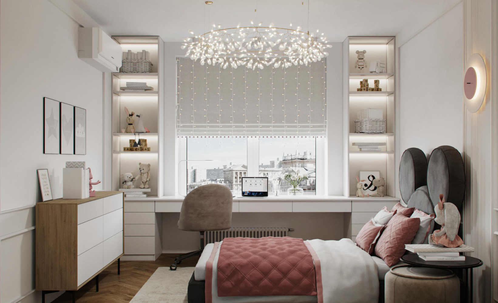 Розетки. У стола — 3–4 штуки для лампы, ноутбука, принтера и настольных часов. У кровати — для ночника и зарядки телефона. В игровой зоне — для пылесоса, увлажнителя воздуха или проектора.