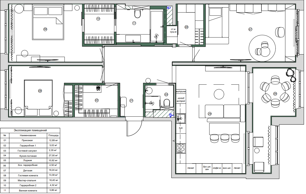 Изначальный план квартиры был с избытком неиспользуемой площади в проходах. Мы демонтировали часть перегородки гостевой комнаты, чтобы расширить входную зону и вписать туда полноценный гардероб. Коридор немного уменьшили, и на этом месте появилась постирочная. В спальне хозяев также убрали лишнюю стену, создав приватный проход в личную гардеробную и санузел.