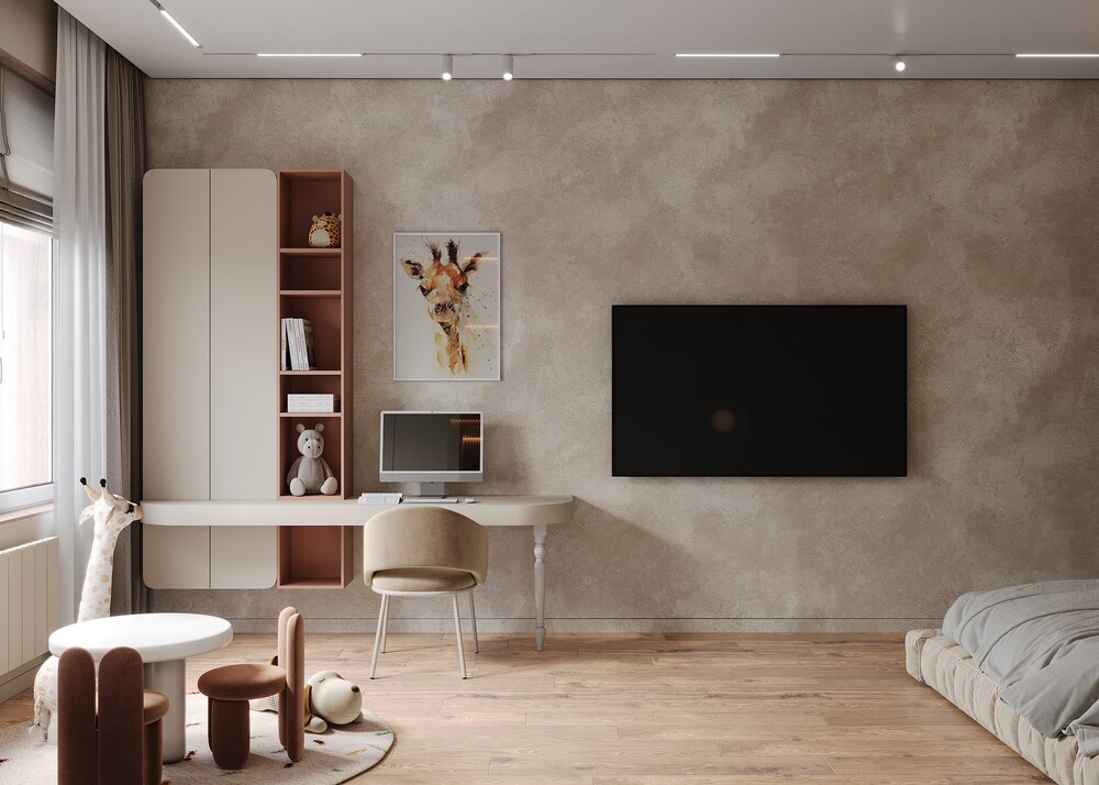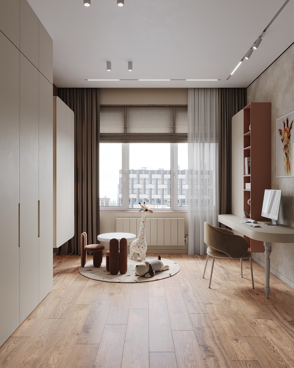 Комнату для ребенка мы спроектировали на перспективу, чтобы интерьер оставался актуальным еще много лет. Помещение разделено на место для сна, рабочий стол и игровую зону с ковром. Установили шкаф и использовали систему хранения, которая буквально парит над полом, облегчая уборку.