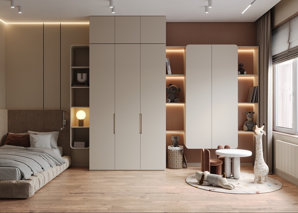 Светлые стены служат фоном для игрушек, а деревянные детали добавляют визуального тепла. Проходы оставили широкими, чтобы у ребенка было достаточно места для активных игр на полу.