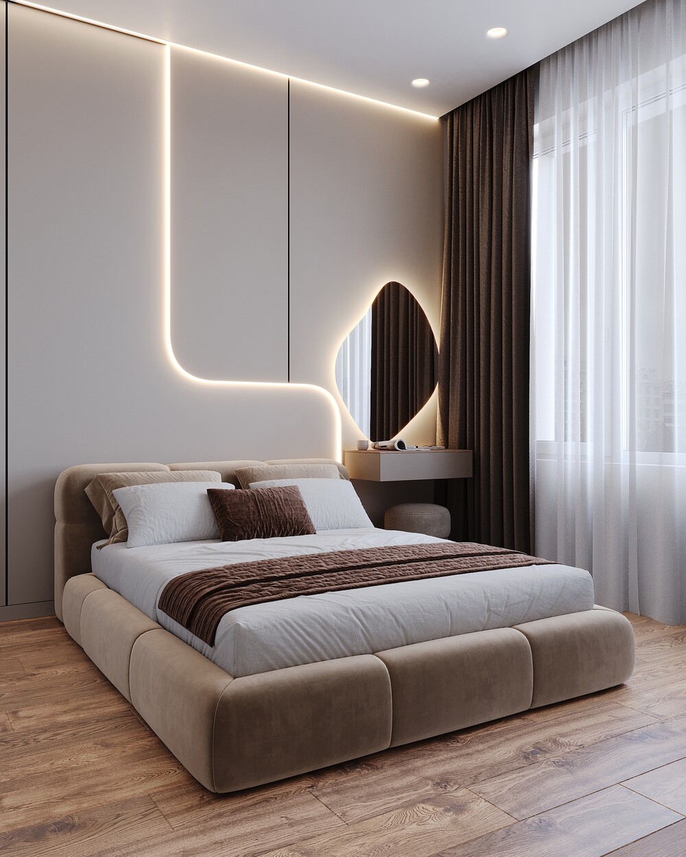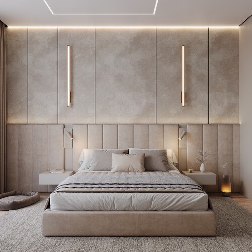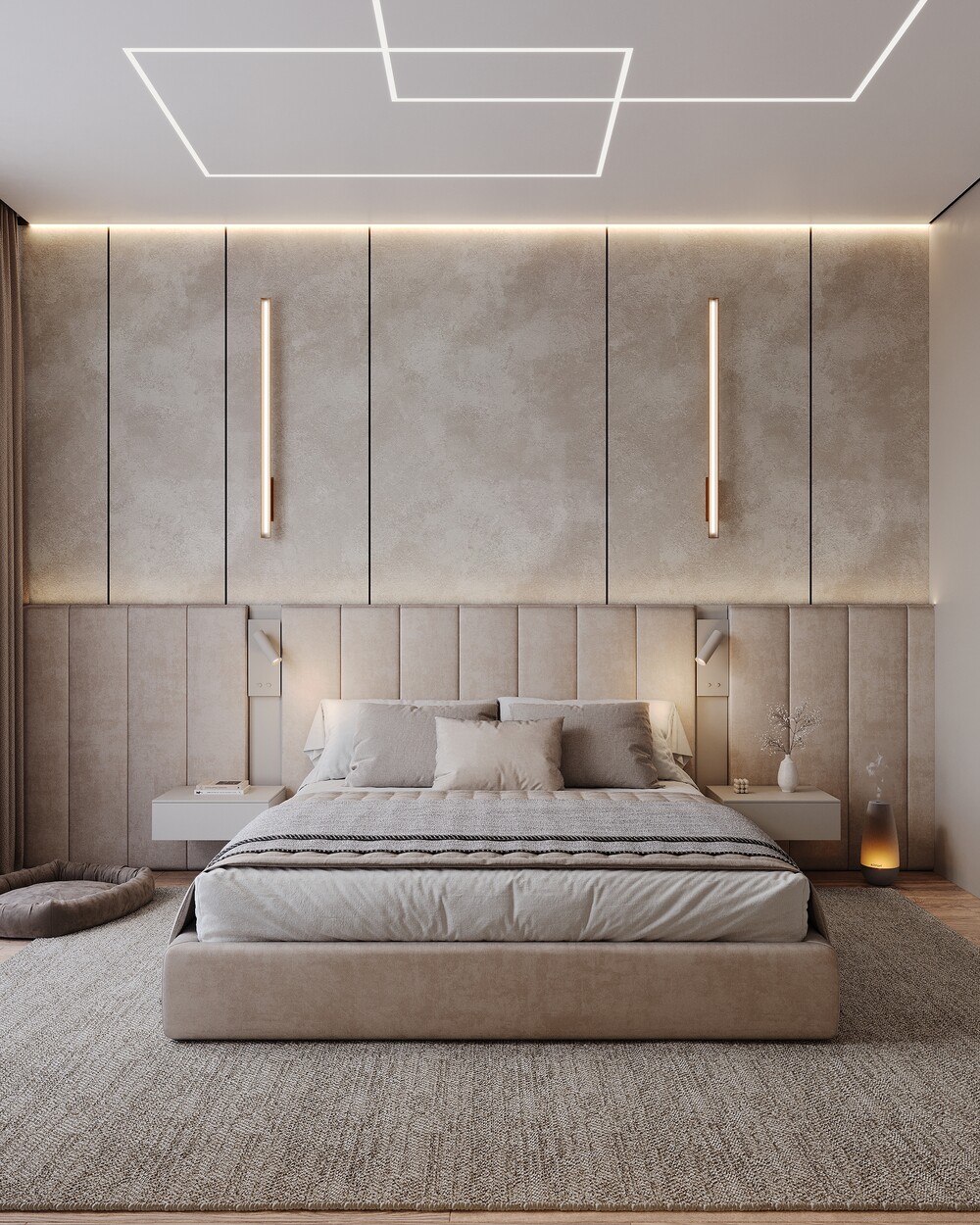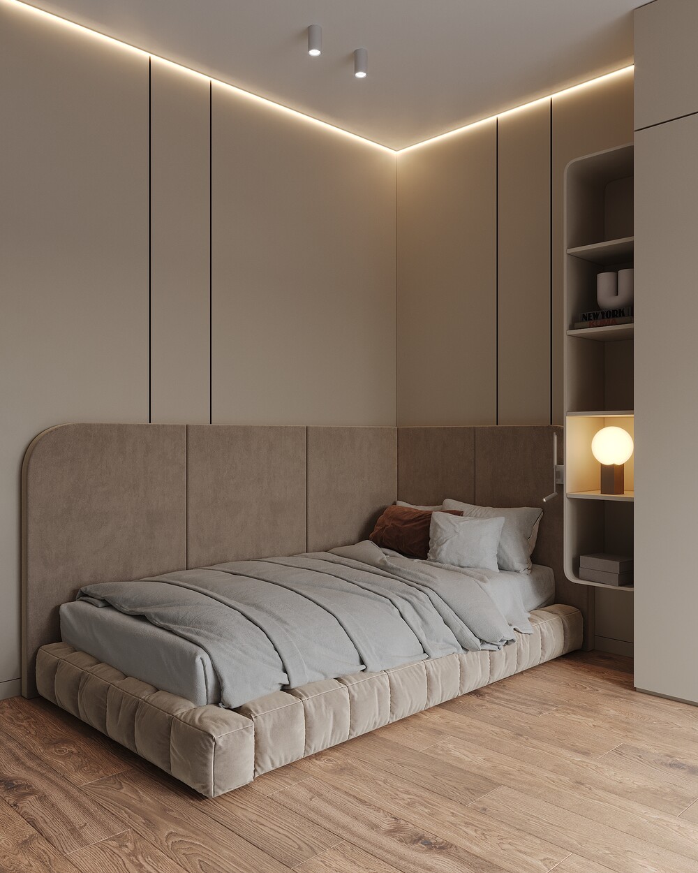 Комнату оформили в пастельной гамме, сделав упор на тактильные материалы: микроцемент, фактурную штукатурку и дерево. Кровать с мягким изголовьем дополнили вертикальными панелями со встроенными лампами.