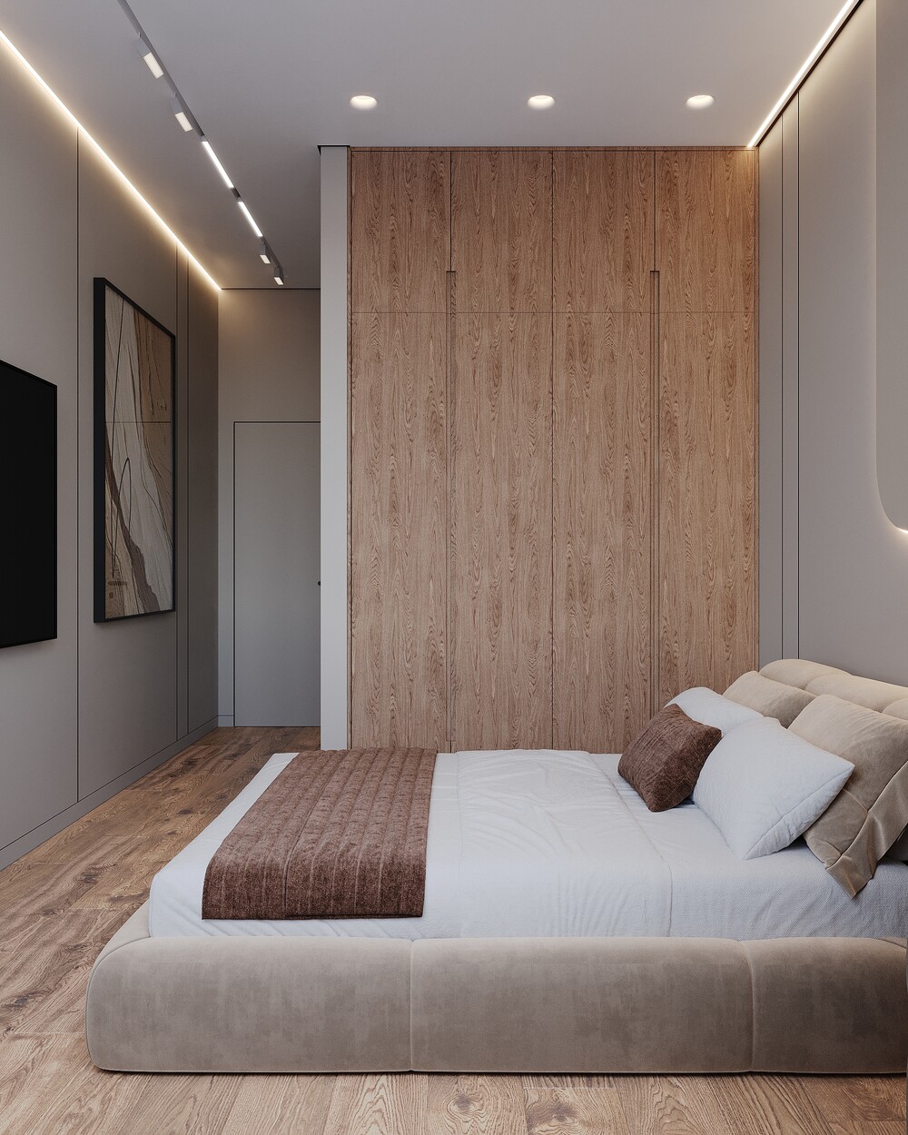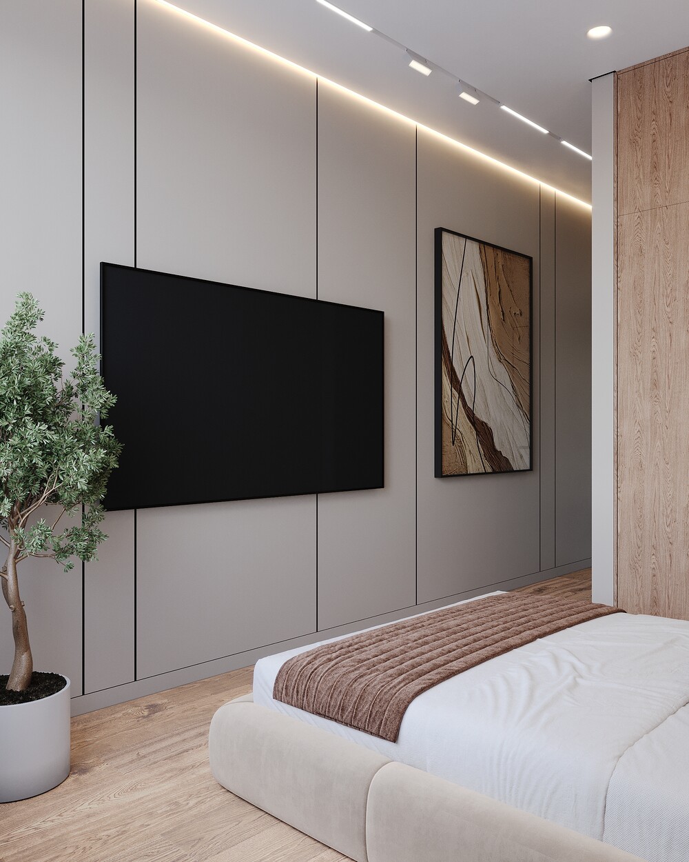 Напротив расположили минималистичную ТВ-зону и трековое освещение на потолке для равномерного залива светом. Никаких громоздких предметов — только самое необходимое для комфортного пребывания.