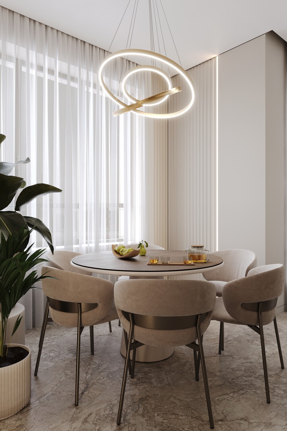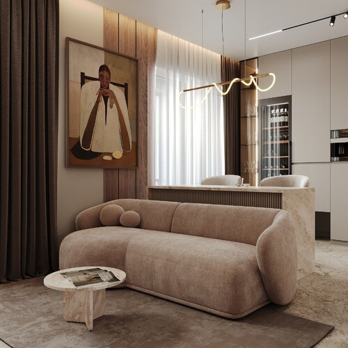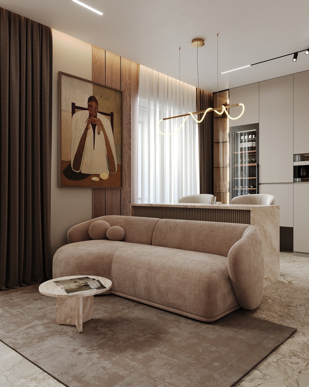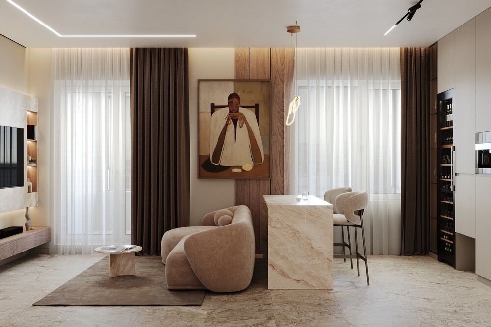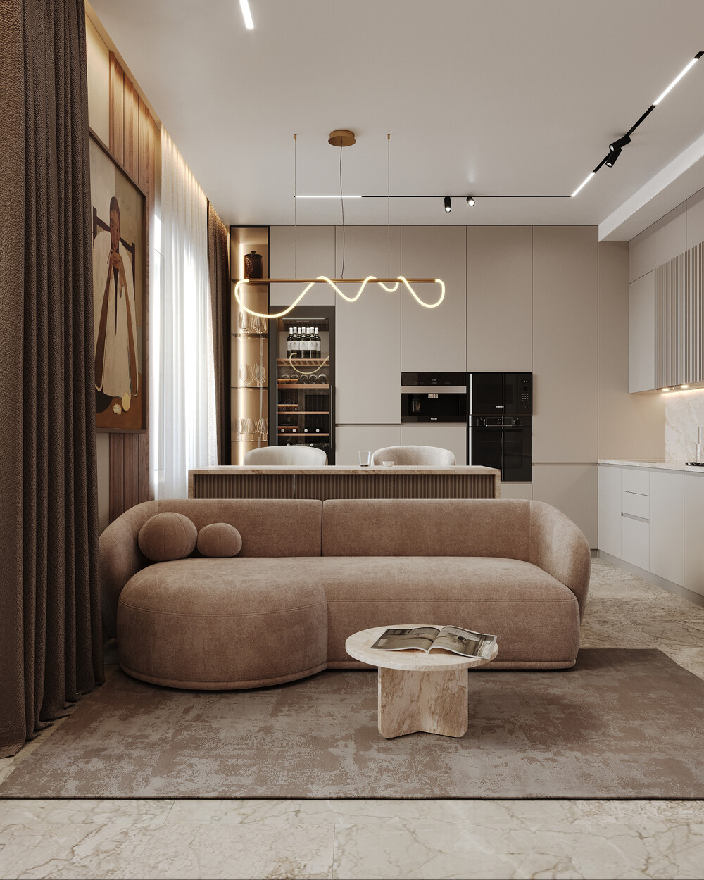 Интерьер выполнен в современном минимализме с элементами джапанди. Основа палитры — светлые пастельные тона от бежевого до глубокого коричневого без ярких цветовых пятен. Акцент сделан на сочетании разных фактур: матовой краски, дерева и холодного камня. Такое решение сохраняет визуальную чистоту и делает пространство функциональным.