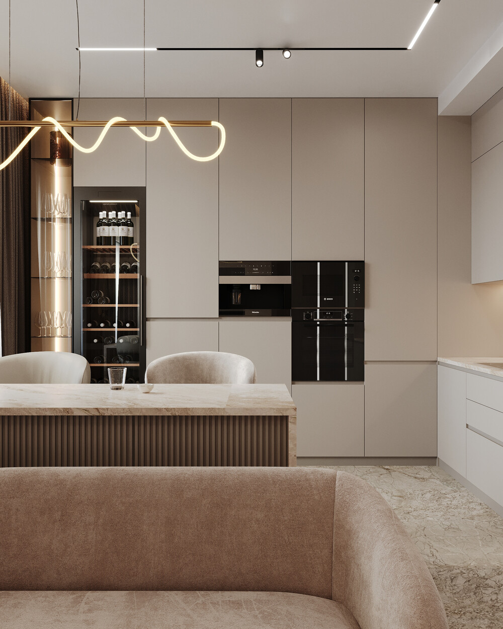 Кухонный гарнитур мы объединили с гостиной, установив функциональный остров для завтраков и быстрых перекусов. Фасады выбрали в спокойном бежевом цвете без выступающих ручек, чтобы мебель сливалась со стенами. Всю бытовую технику встроили в колонны, сохранив единство поверхностей и чистоту линий.