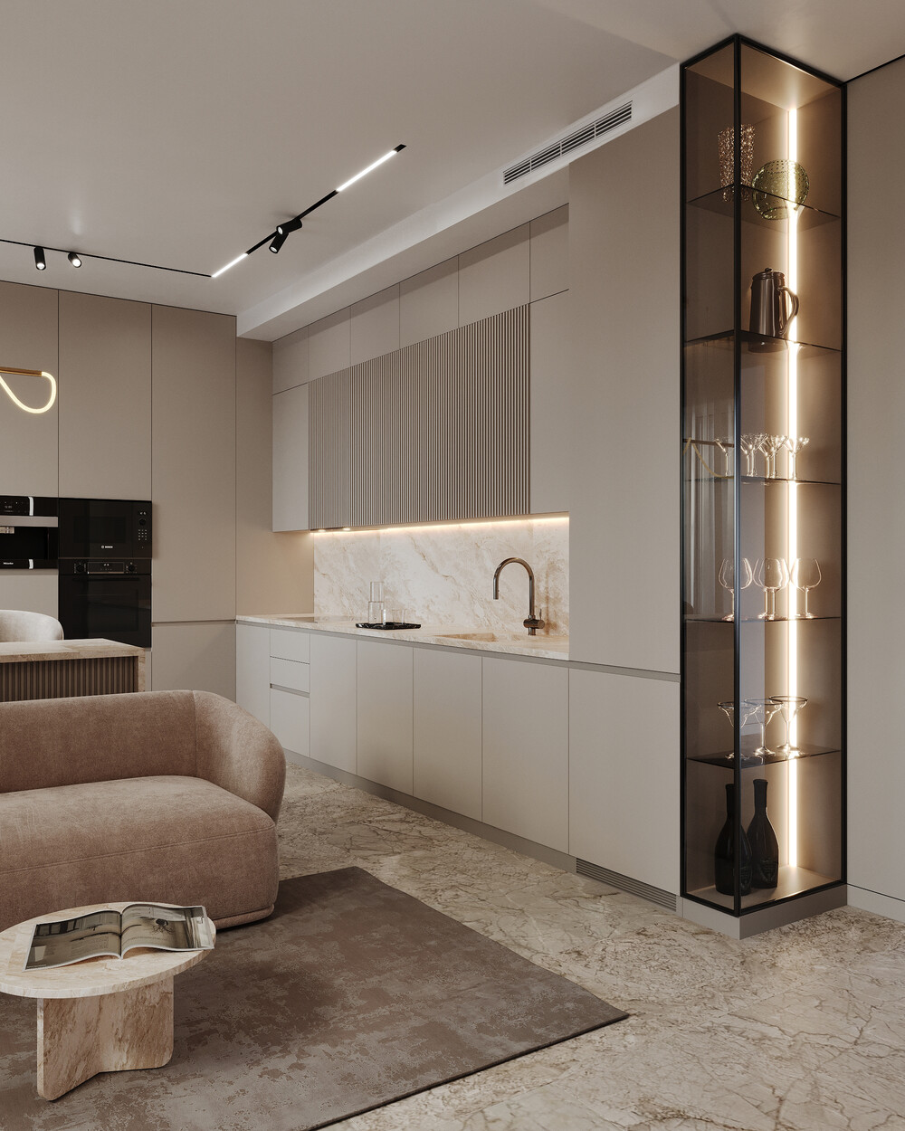 Рабочий фартук и столешницу выполнили из износостойкого керамогранита с линейным освещением рабочей зоны. Высокий шкаф со стеклянными вставками добавил интерьеру глубины, не перегружая при этом обеденную зону.