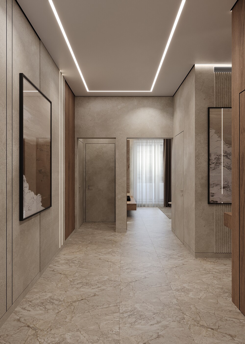 Мы установили фасады в один уровень со стенами, чтобы шкафы не бросались в глаза и не загромождали проход. Вдоль потолка и стен пустили световые линии, которые помогают визуально вытянуть пространство прихожей. Узкая консоль и небольшой пуф завершают композицию, делая вход в квартиру удобным и аккуратным.