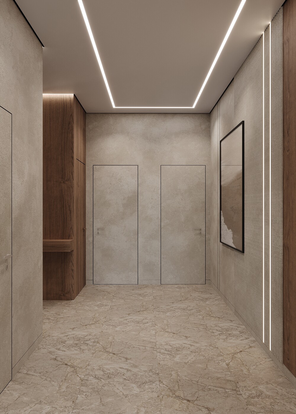 Входную группу выполнили в строгом минимализме, используя светлую штукатурку и керамогранит на полу. Зону гардероба выделили деревянными панелями, за которыми скрываются глубокие системы хранения для верхней одежды.