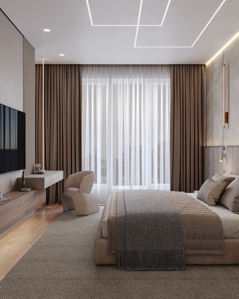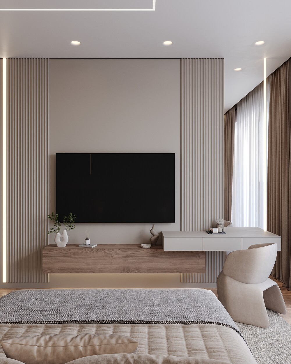 Зона ТВ выглядит максимально просто — здесь только длинная подвесная тумба и рейки с контурным светом. После перепланировки вход в личный санузел и гардеробную осуществляется прямо из спальни.
