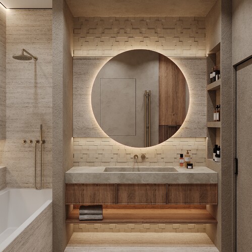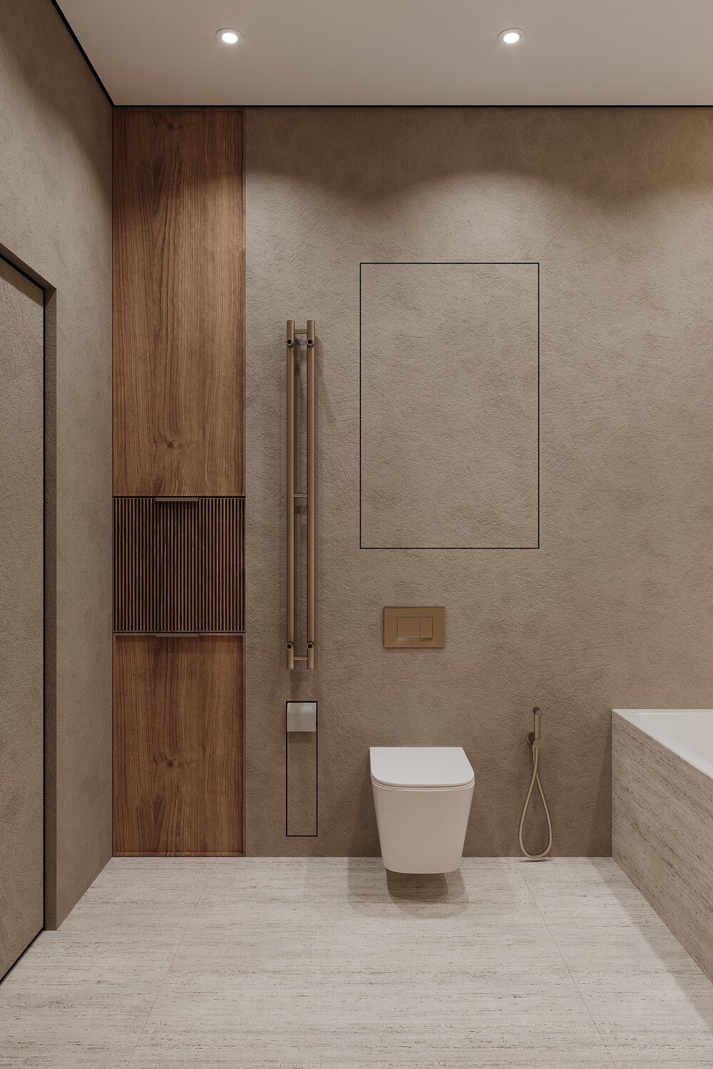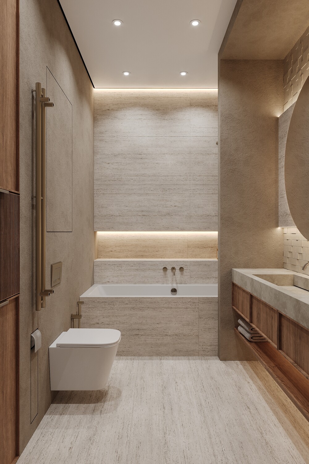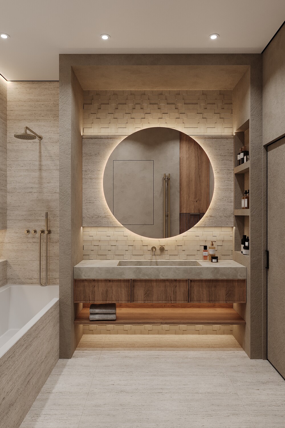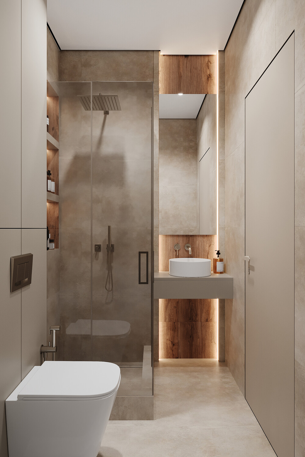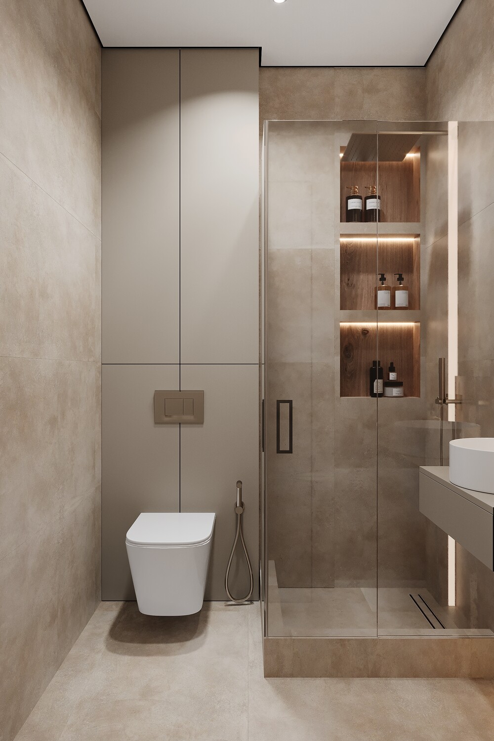 Санузел при спальне выдержан в бежевых тонах с использованием микроцемента и керамогранита под камень. Мы отказались от лишнего декора в пользу функциональных ниш с подсветкой, где удобно хранить косметику.