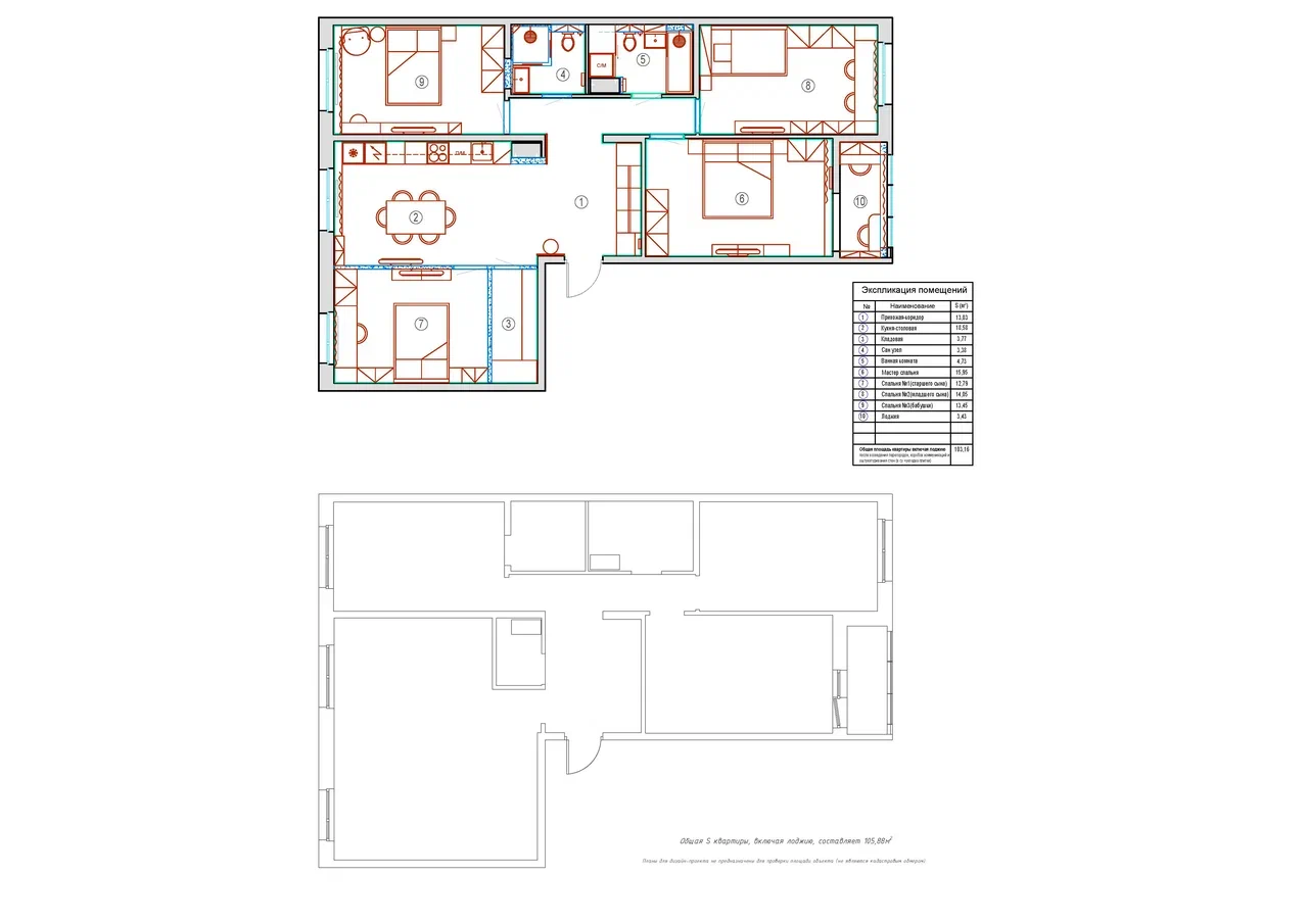 Изначально в квартире не было места для кладовой и отдельной комнаты для старшего сына. Пространство разделили перегородкой: так удалось выделить полноценную спальню и найти место для хозблока со стороны кухни. Конфигурацию санузлов тоже изменили — убрали проход из спальни и сделали входы в обе мокрые зоны из коридора. Бывшую лоджию утеплили и объединили с комнатой родителей, организовав там два полноценных рабочих места.