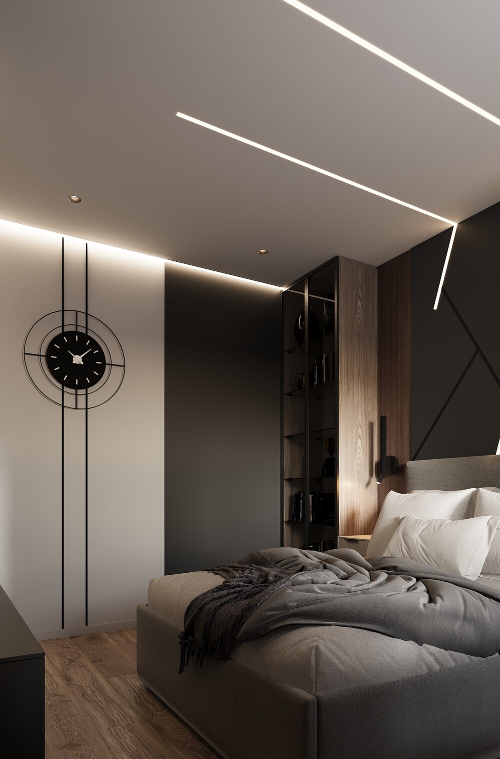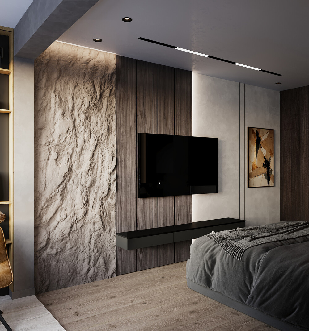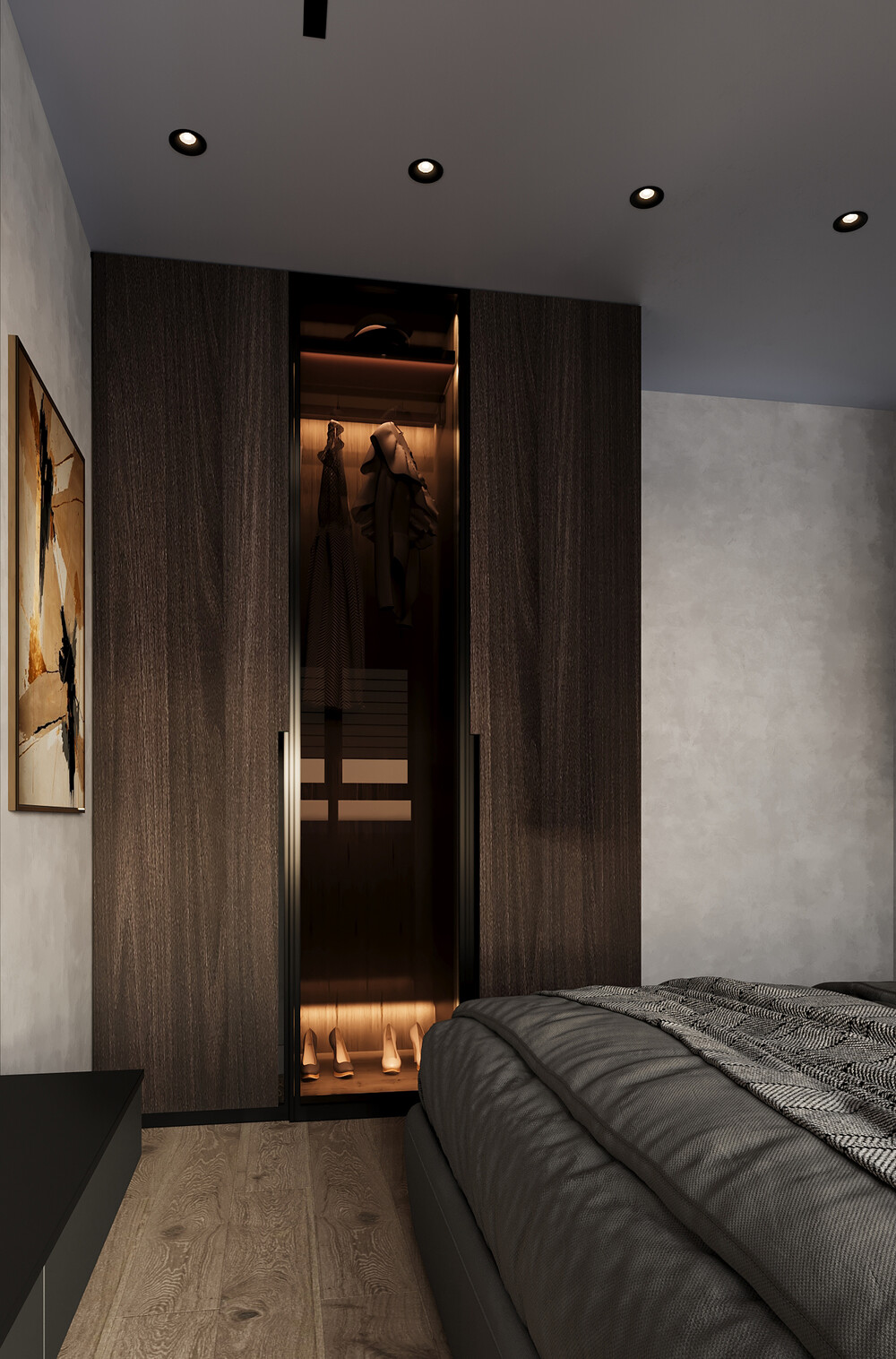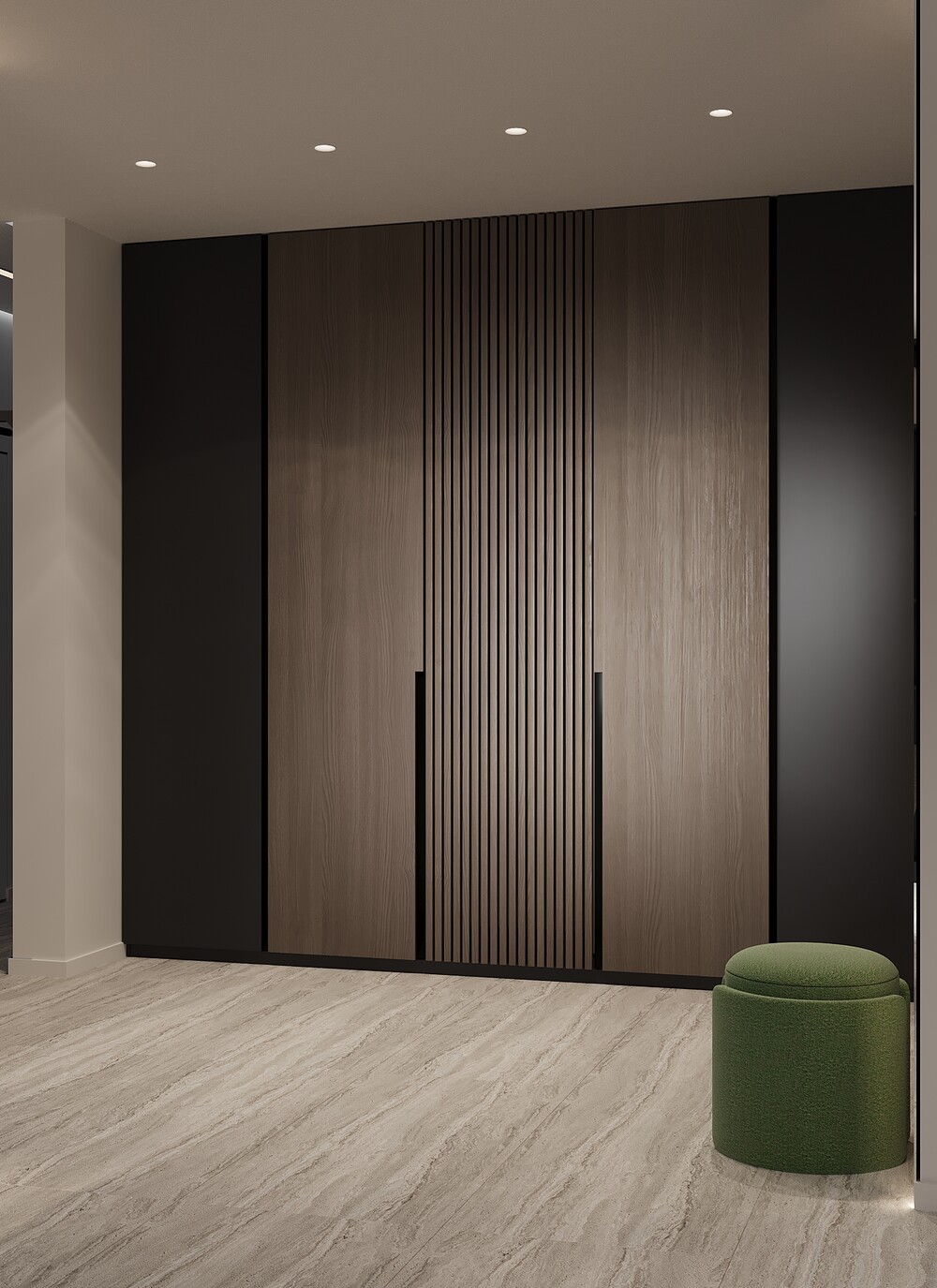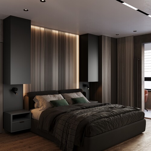 В интерьере мастер-спальни мы использовали глубокие антрацитовые и кофейные оттенки. Изголовье кровати выделили тонкими вертикальными рейками, широкоформатными панелями и скрытой контурной подсветкой. Напротив спального места закрепили подвесную ТВ-тумбу, сохранив визуальную легкость и свободное пространство на полу.