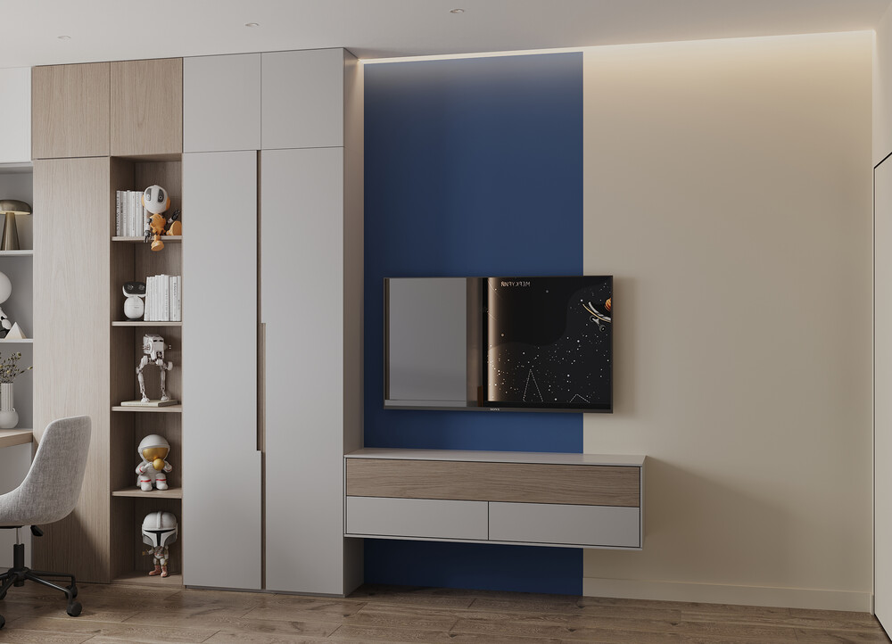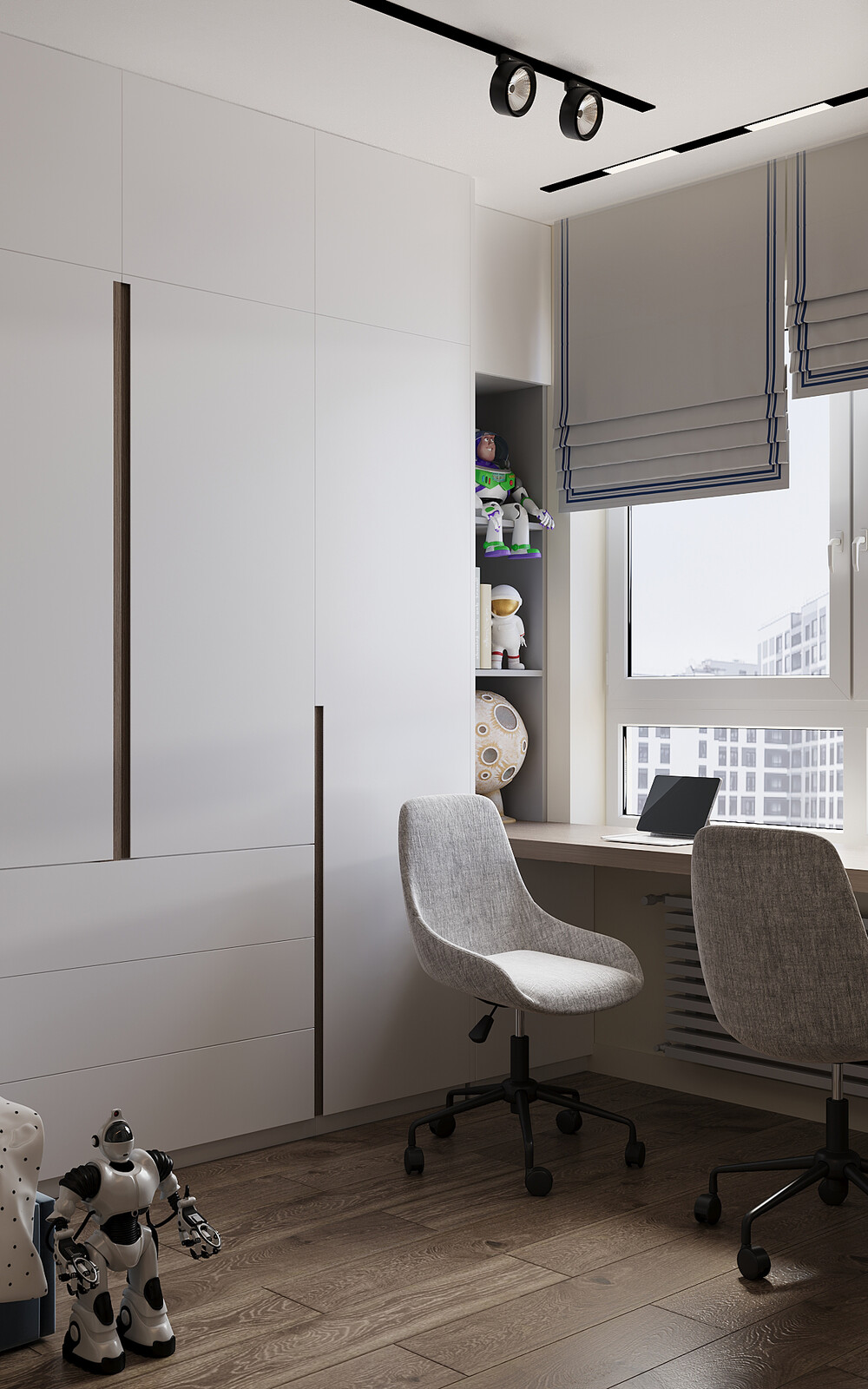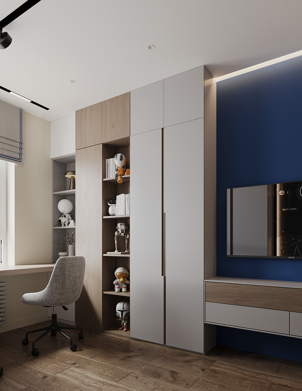 Вторая детская получилась более активной за счет акцентной стены с изображением космонавта и контрастных синих деталей. В этой комнате предусмотрели много открытых полок для игрушек и книг, сохранив при этом удобное место для занятий. Пространства спроектировано «на вырост», чтобы интерьер оставался актуальным через несколько лет.