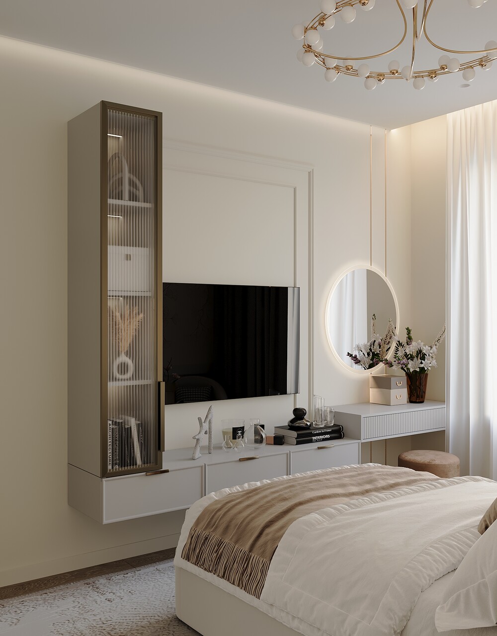 У окна организовали зону отдыха с туалетным столиком и удобным пуфом для чтения или ухода за собой. Золотистая фурнитура и мягкое освещение добавляют интерьеру тепла, не перегружая его лишними деталями.