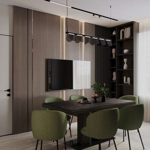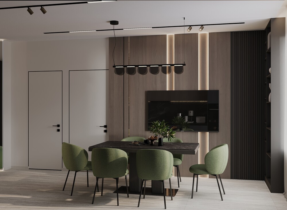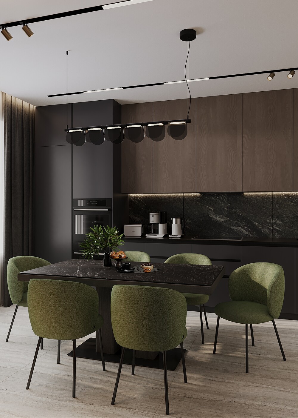 Обеденную группу из массивного стола и мягких кресел в приглушенно-зеленом цвете расположили в центре. За освещение отвечают трековые системы и линейный светильник над столом, что позволяет настраивать разную яркость под время суток.