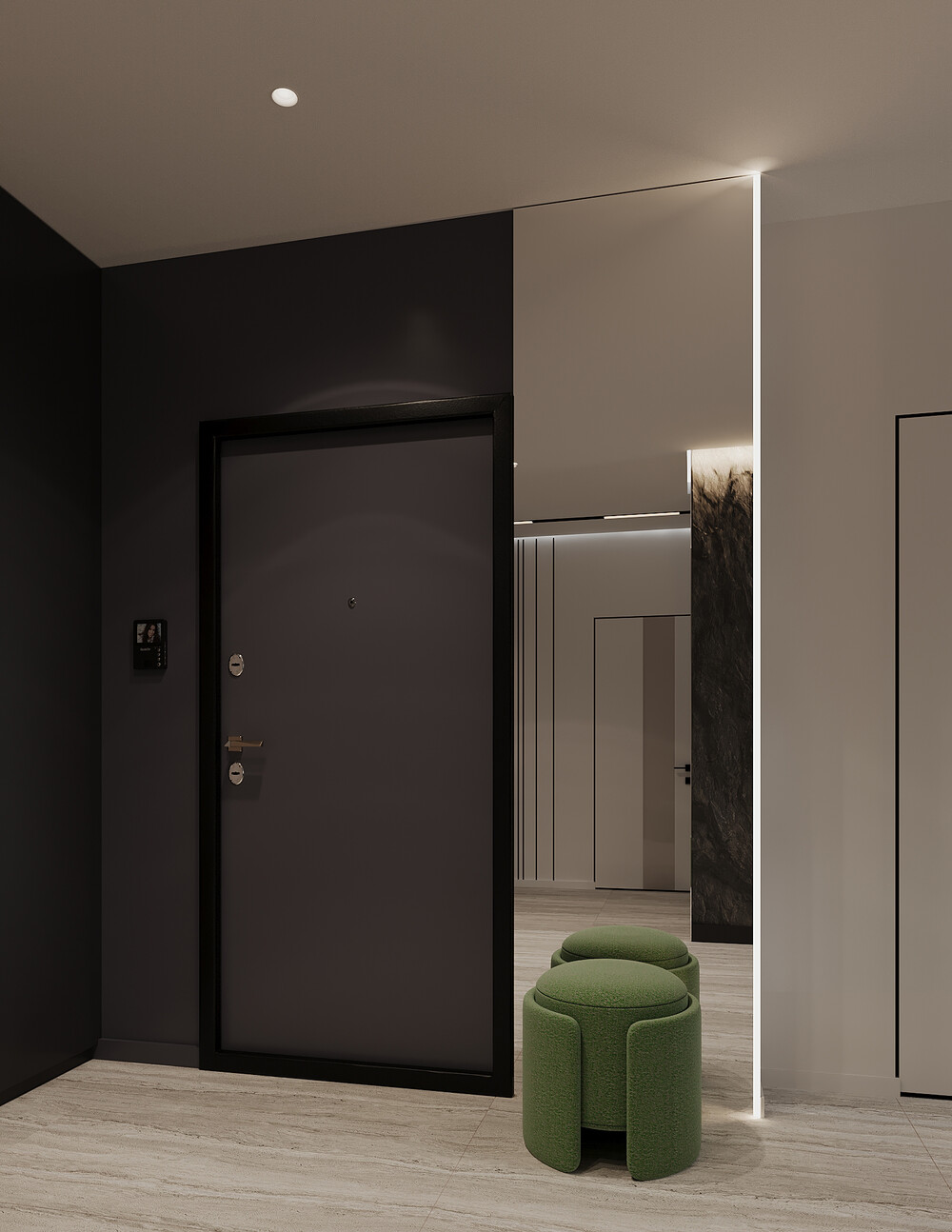 Прихожая спроектирована в стиле современного минимализма с акцентом на чистые линии и строгую геометрию мебельных конструкций. В отделке преобладают тёмные серые и бежевые тона, которые дополнены природной текстурой дерева и контурной подсветкой под потолком.