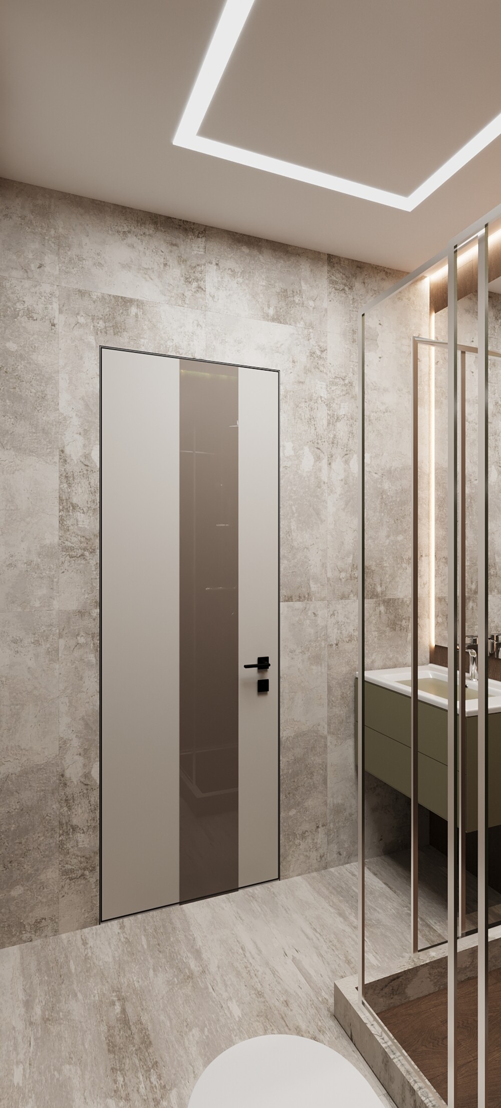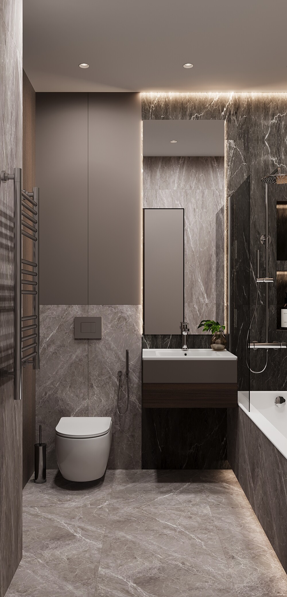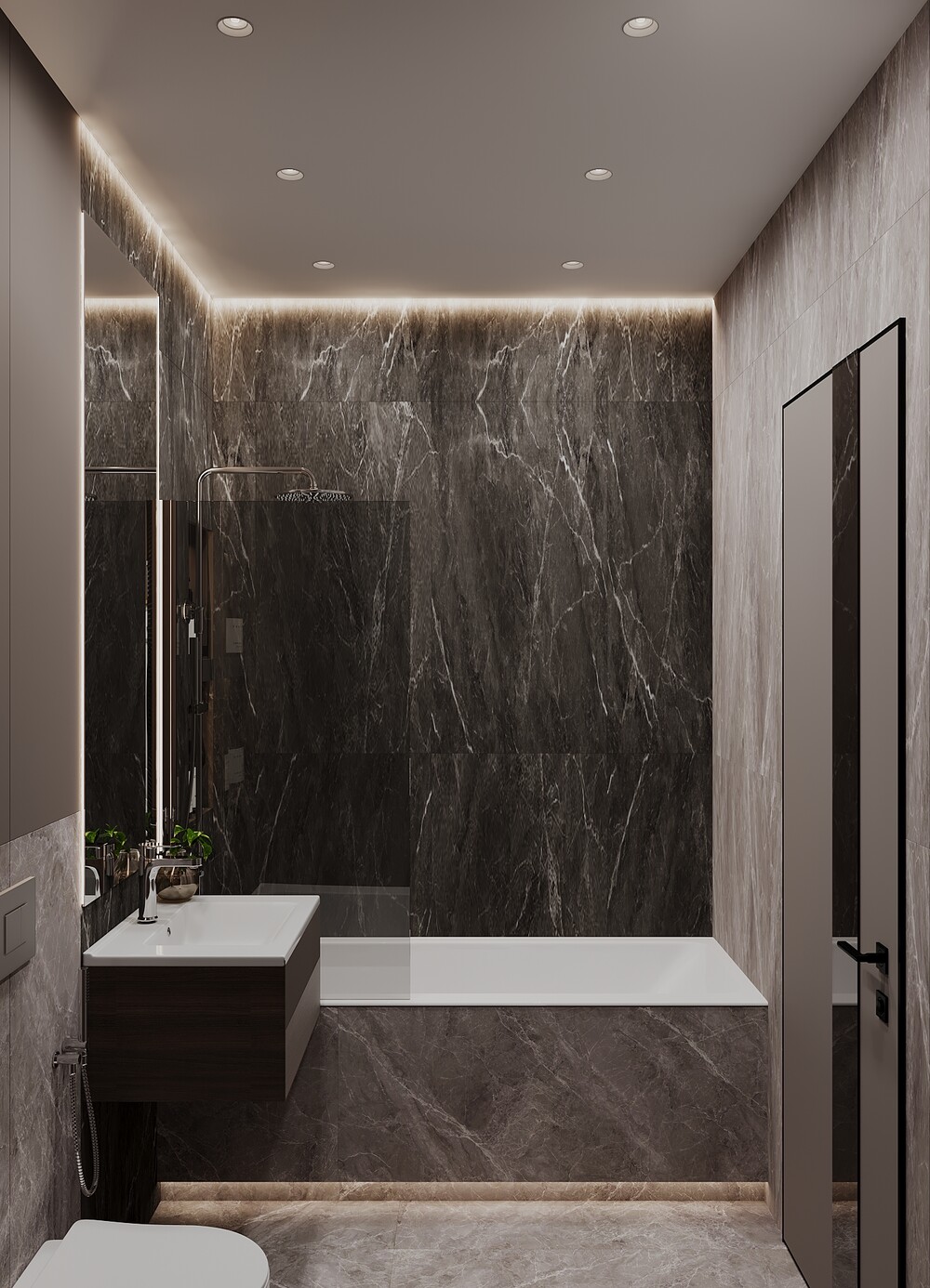 Натуральные текстуры камня — интегрированы в отделку санузлов и кухни для придания пространству статусности и надежности.