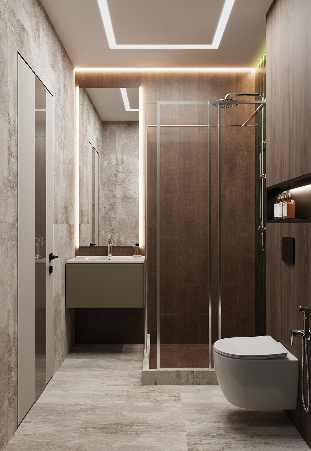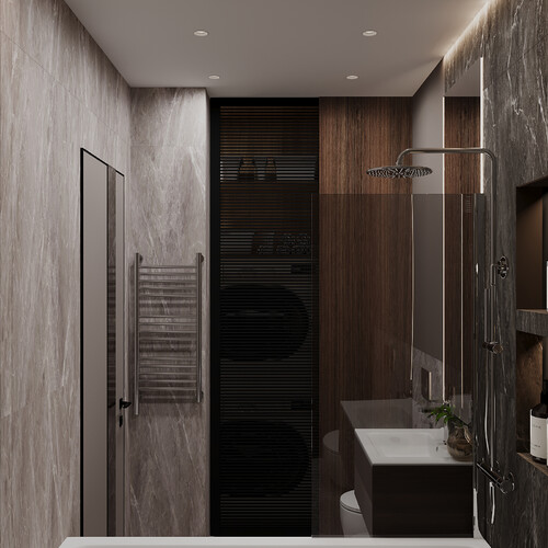 Все инженерные узлы и инсталляции скрыли в нишах, которые дополнительно подсветили для удобства и визуальной глубины. Душевую зону здесь оборудовали встроенным тропическим душем для максимального комфорта.