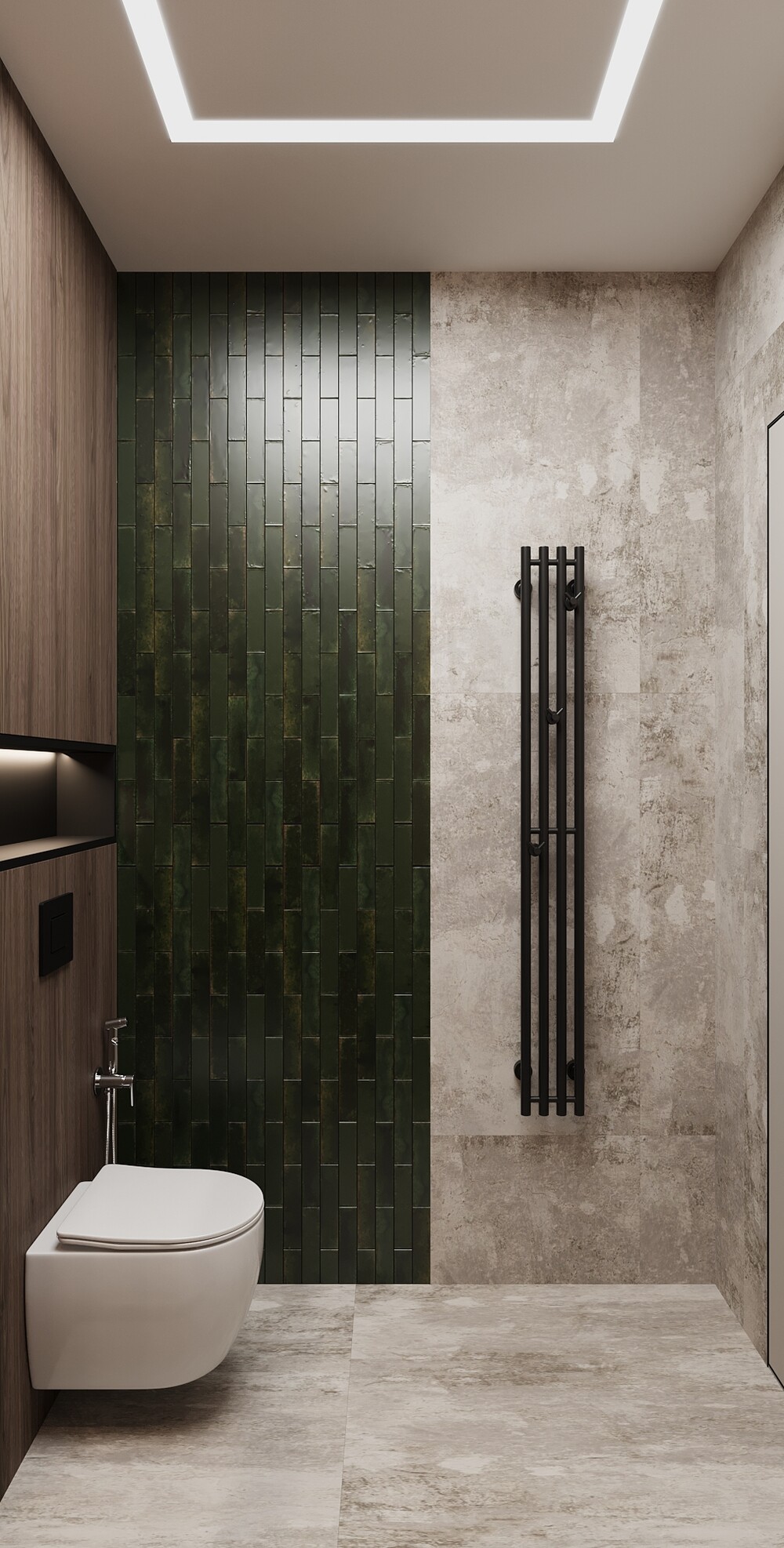 Гостевой санузел оформили в более строгом стиле с использованием плитки под бетон и вертикальных зеленых акцентов, реализованных с помощью узкой глянцевой плитки, напоминающей бамбук.