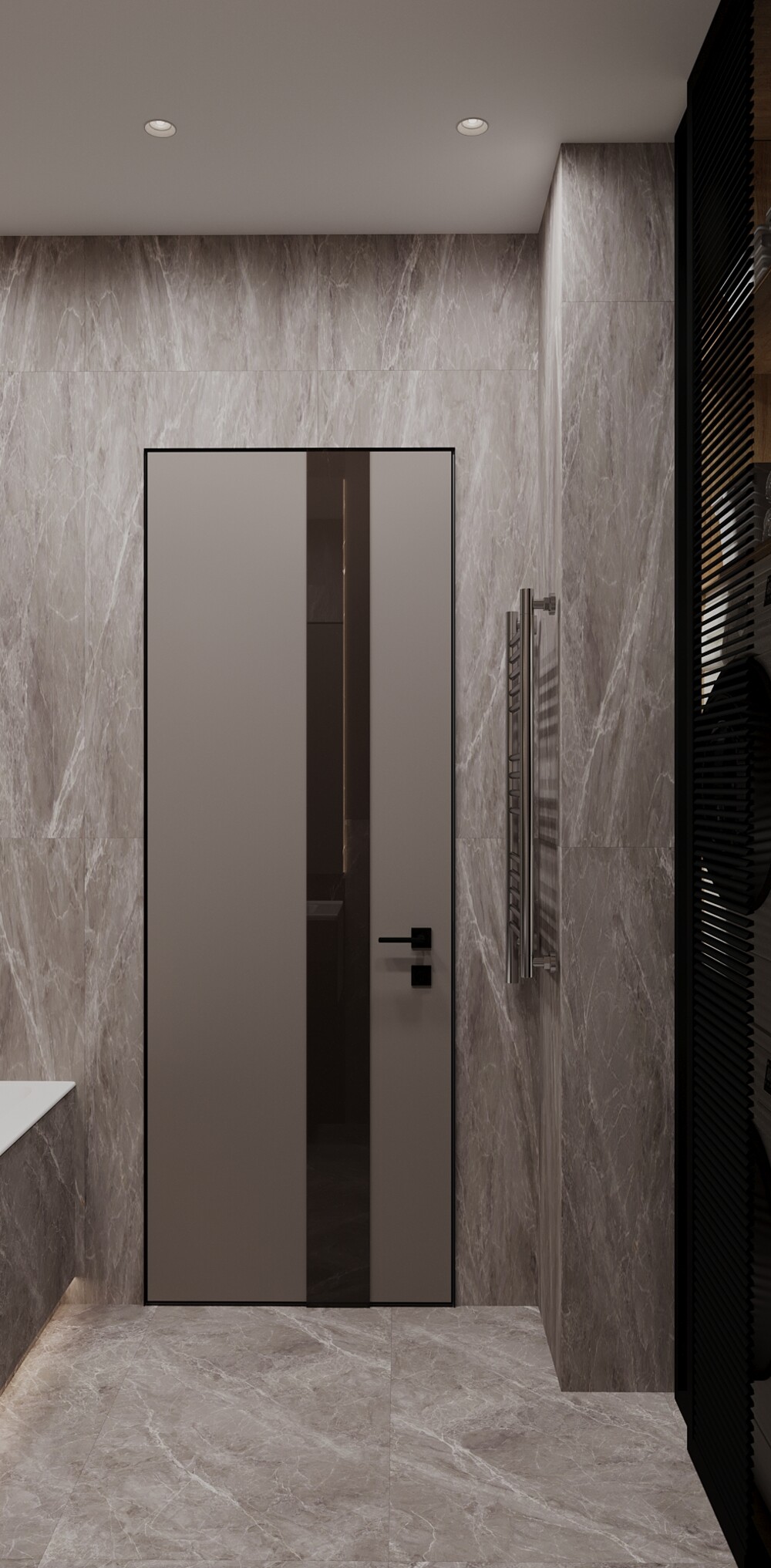 Интерьер выдержан в стиле современного минимализма. Основная палитра состоит из глубоких серых и бежевых оттенков. Темные акценты добавляют пространству графичности и подчеркивают архитектурные линии комнат. Такое цветовое сочетание практично в эксплуатации и долго остается актуальным, не надоедая владельцам.