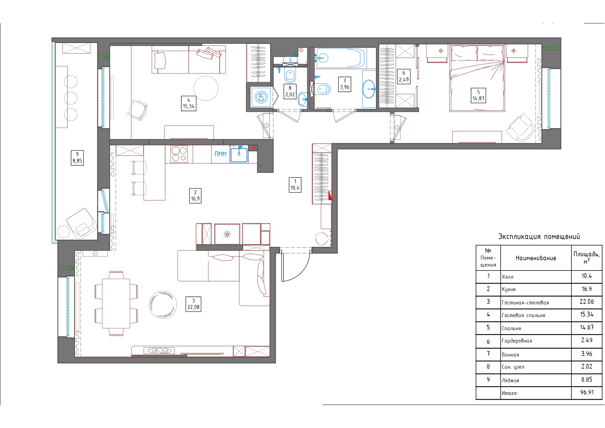 Дизайн интерьера квартиры в ЖК «Черная Речка, 41» в Санкт-Петербурге в современном стиле — 97 м²