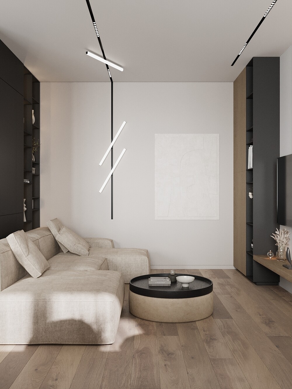 Интегрировать современные технические решения: теневые плинтусы и трековые системы.