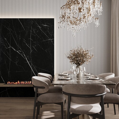 Шпон дерева — использован в мебельных фасадах и стеновых панелях для смягчения интерьера.
