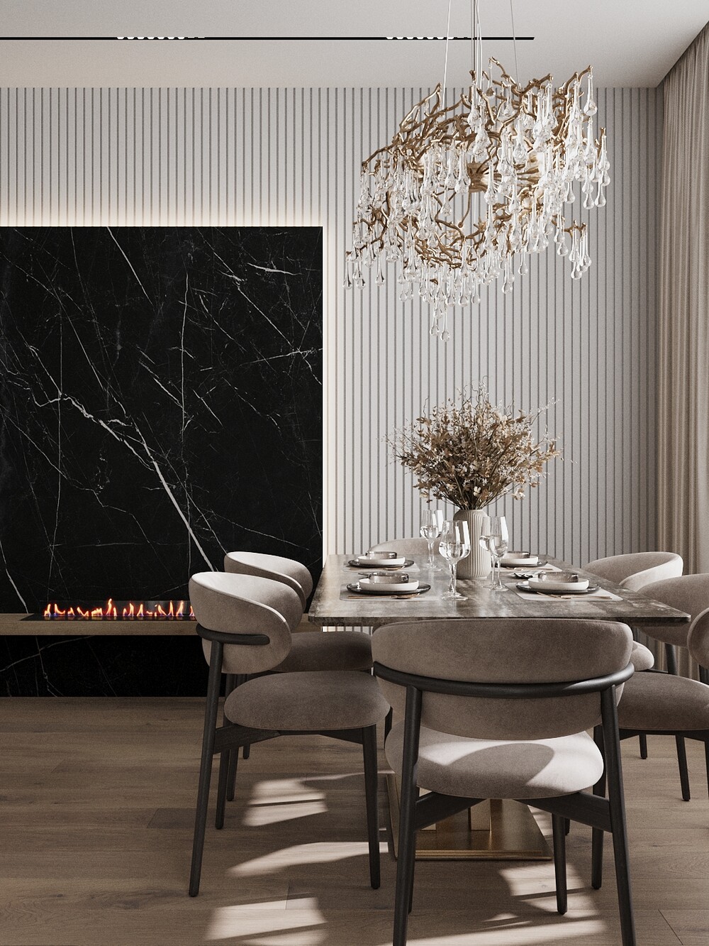 Главная комната разделена на мягкую зону и место для отдыха у камина. Стену за телевизором отделали декоративной штукатуркой с имитацией камня, что помогло зонировать вытянутое помещение. В нишу встроили электрокамин и добавили скрытую подсветку для создания мягкого вечернего света.