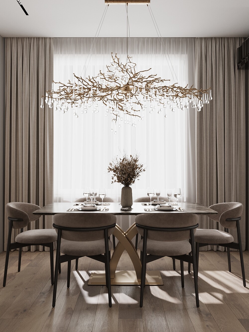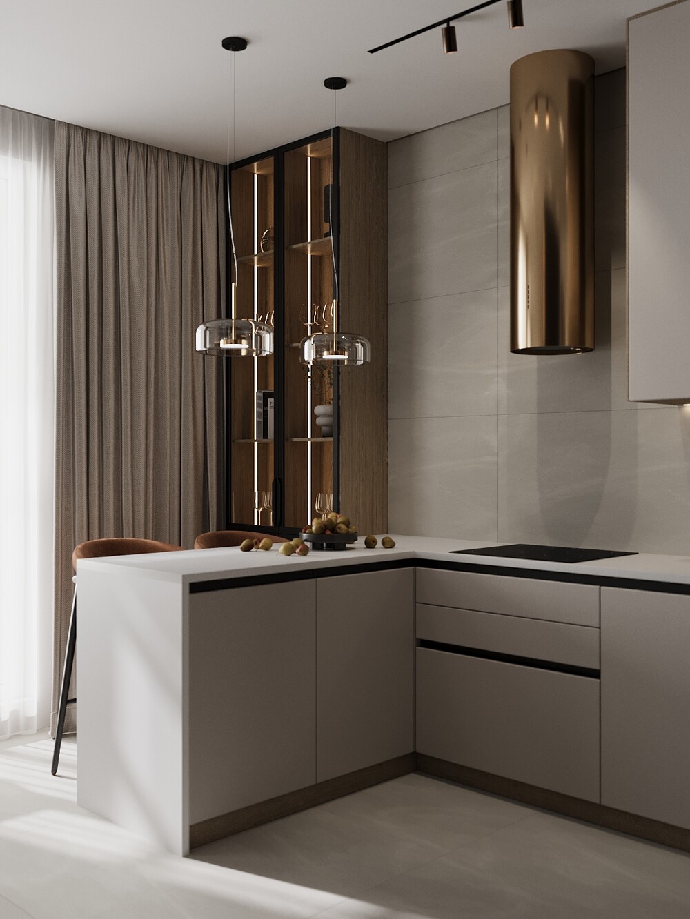Предусмотрели отдельный стол на шесть человек, а для настроения добавили стеклянную витрину с подсветкой. Золотистая вытяжка и графичные светильники над островом выступают в роли ярких декоративных акцентов.