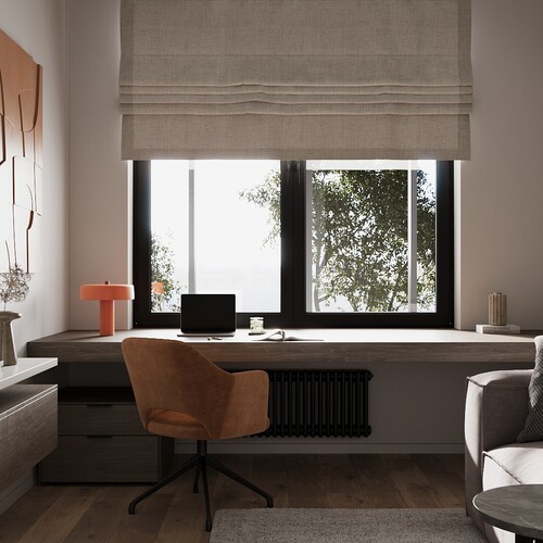 Комната для работы спроектирована с учетом ее будущей трансформации в детскую. Сейчас вдоль окна идет длинная столешница, где удобно работать при естественном свете. За спальное место отвечает диван, расположенный напротив акцентной стены с круглой нишей-ночником.