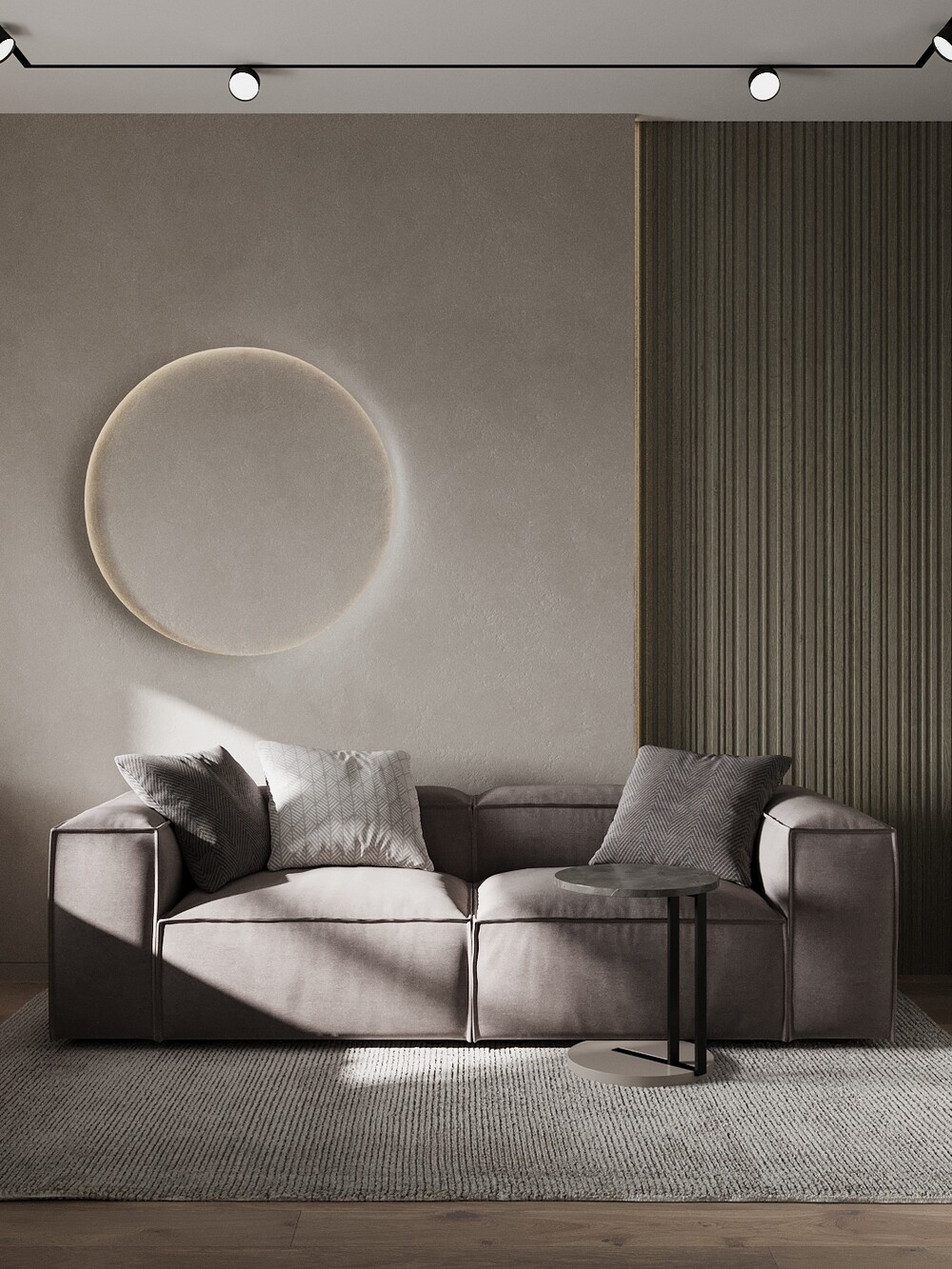 Теневой профиль и треки — заменяют классический плинтус и люстры, отвечая за современный технический образ.