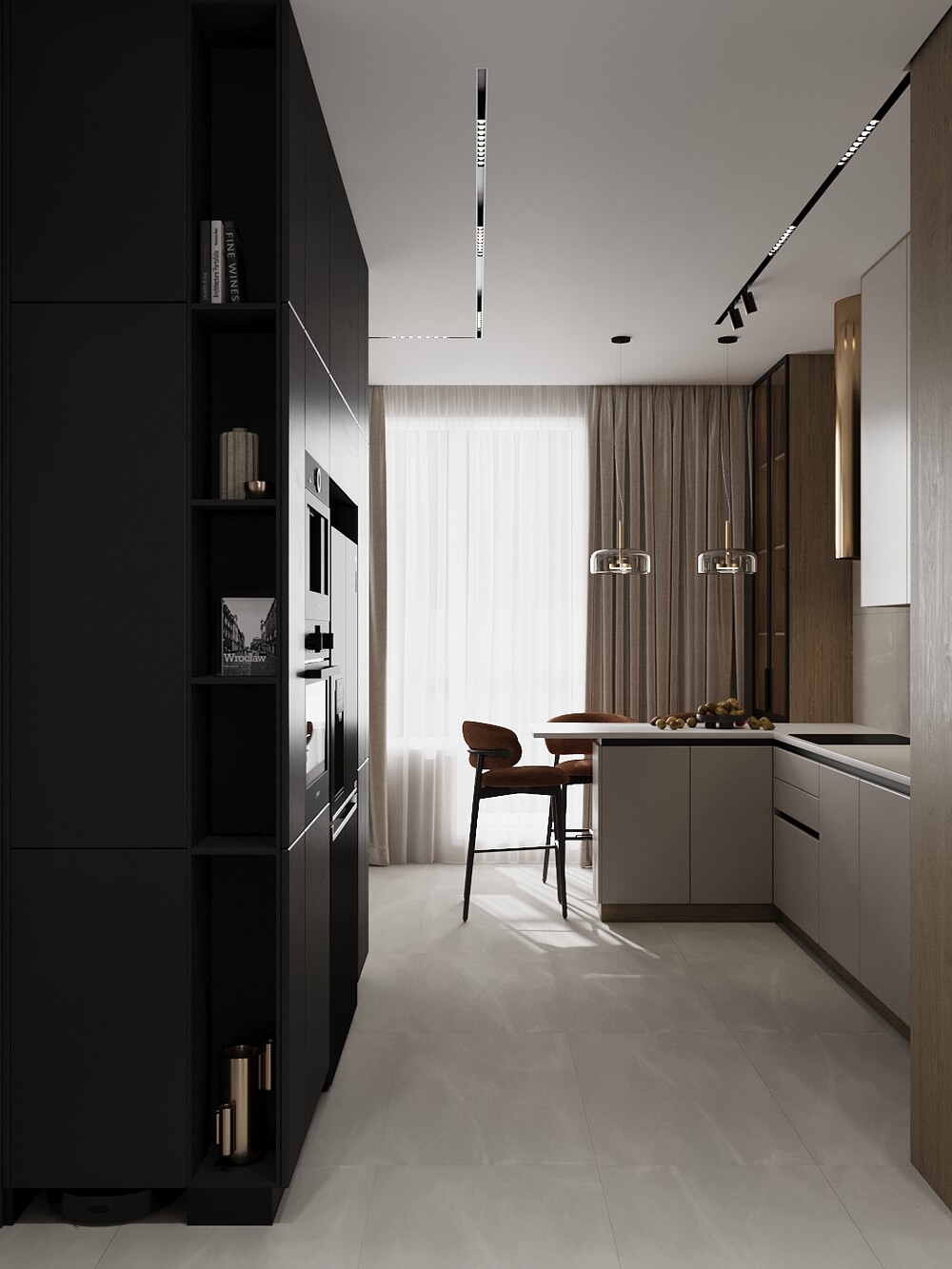 Кухонный гарнитур выполнен в два яруса с использованием матовых фасадов и вставок под дерево. Главная деталь здесь — широкий полубарный остров прямо у окна, где приятно завтракать или работать с ноутбуком. Всю бытовую технику спрятали в высокие колонны-пеналы, поддерживая визуальный порядок.