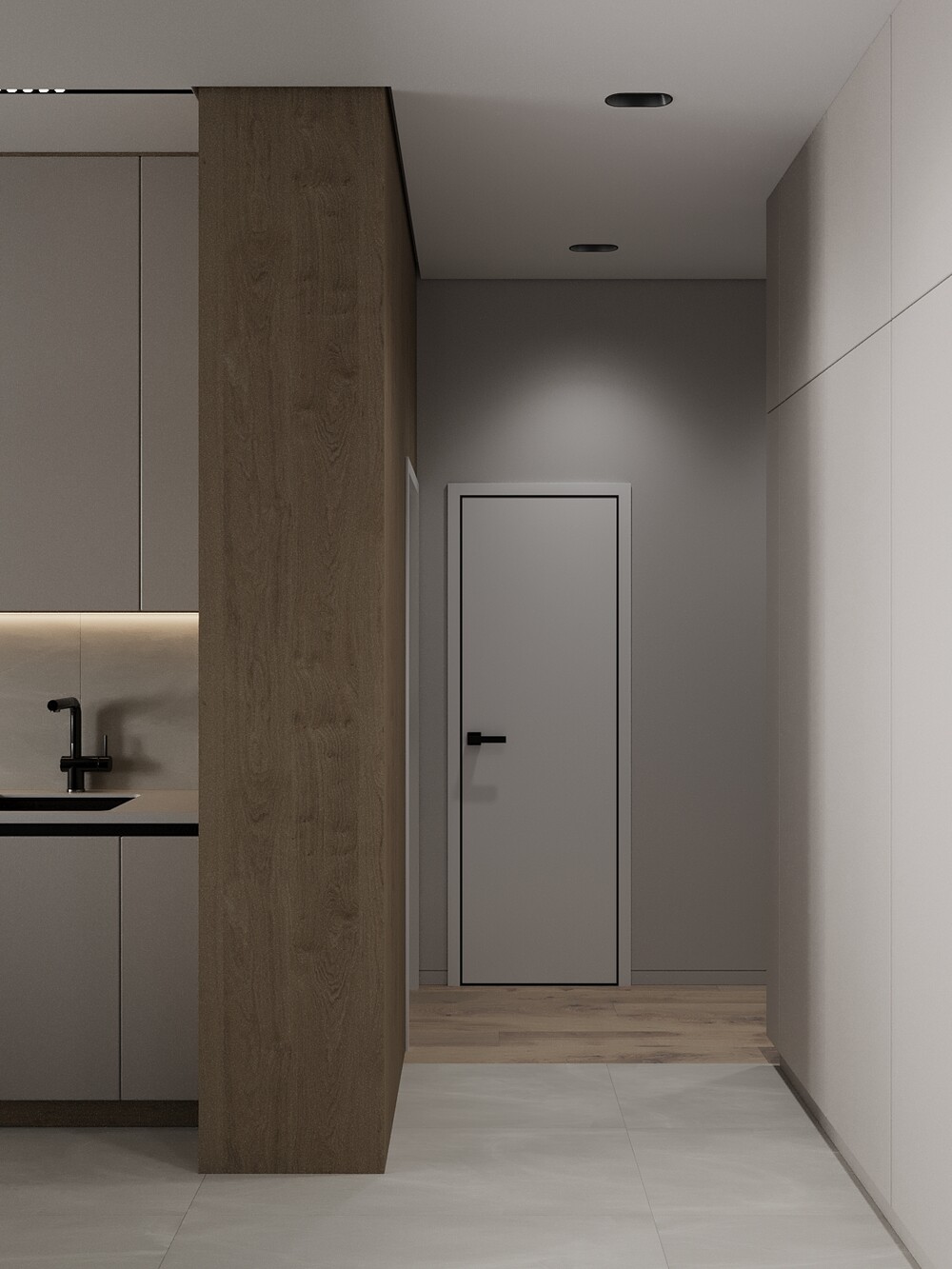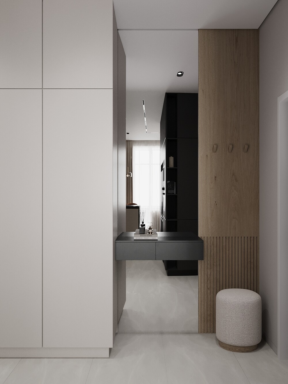 Напольное покрытие из керамогранита плавно переходит в гостиную, создавая единую плоскость без порогов. Черная фурнитура на дверях и мебельных фасадах связывает интерьер прихожей с остальными комнатами.