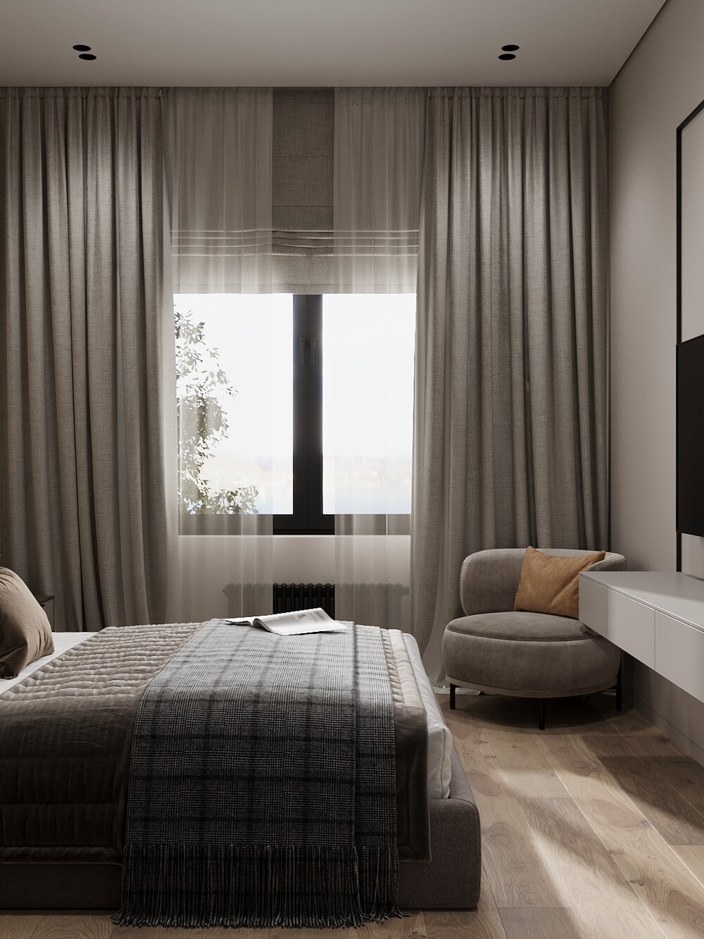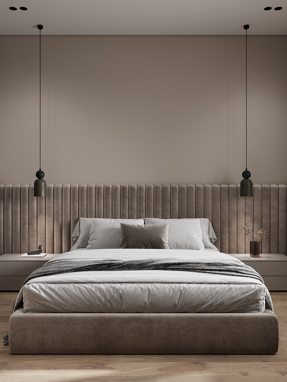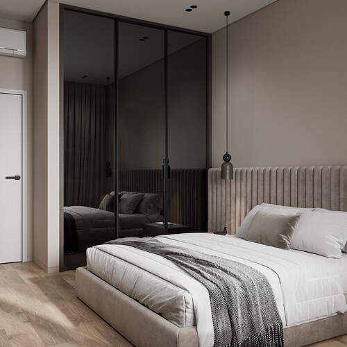 В комнате для отдыха использовали спокойную гамму из бежевых и серо-коричневых тонов. Широкое мягкое изголовье кровати занимает всю стену и задает масштаб всему помещению. Напротив кровати закрепили длинную подвесную консоль, которая не мешает уборке робота-пылесоса.