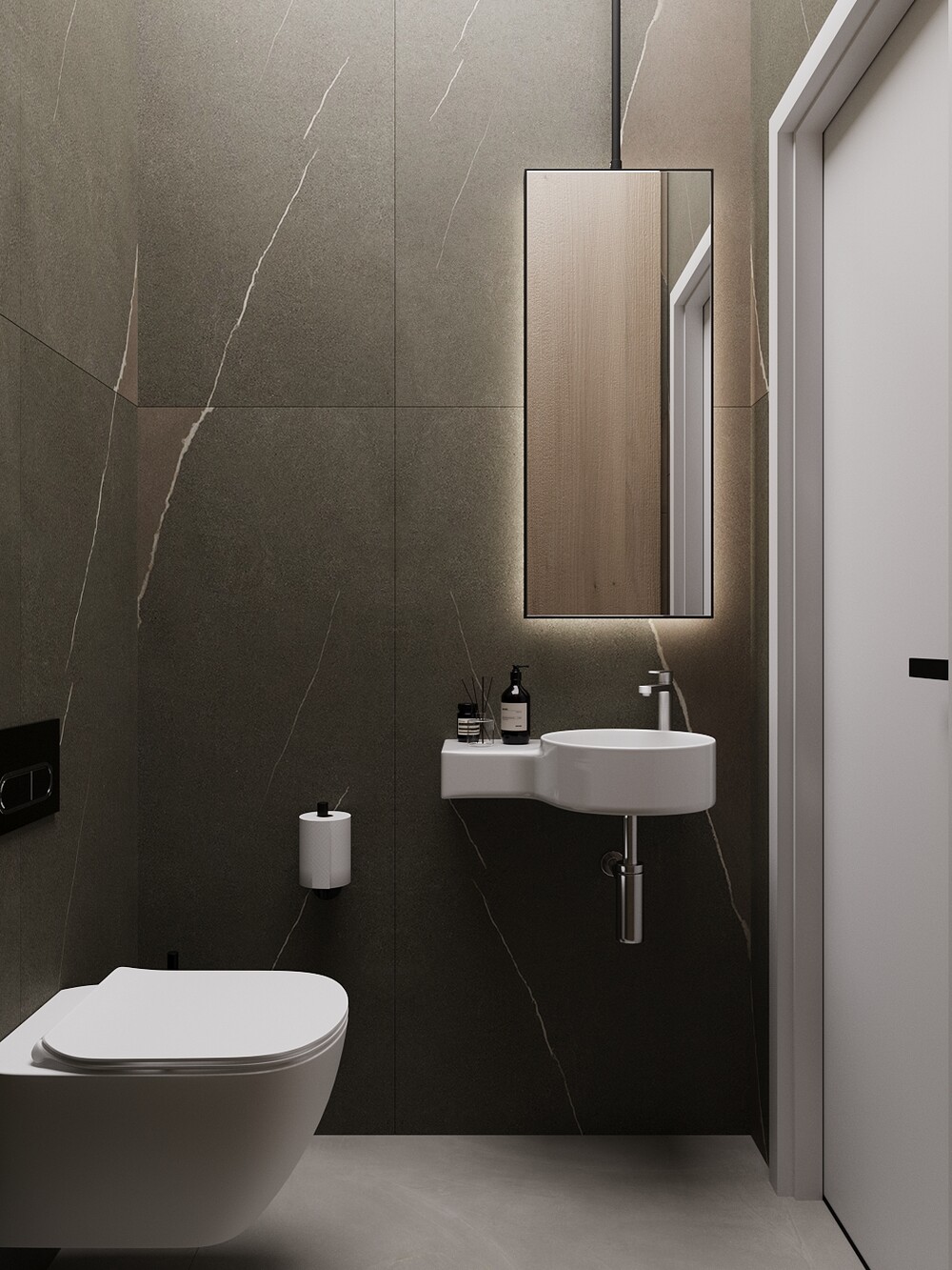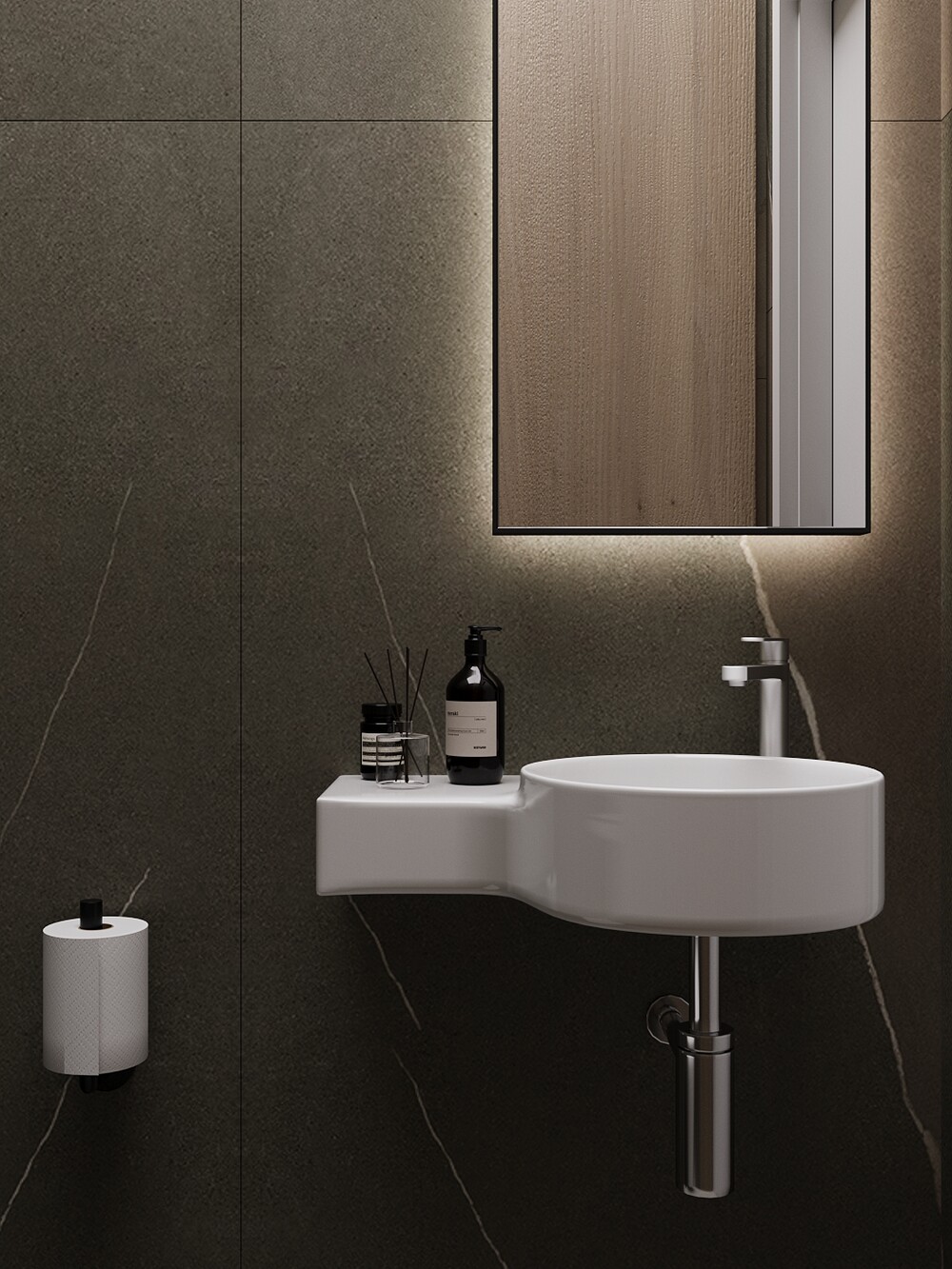 Второй санузел выполнили в более темной, мужской гамме с выразительной текстурой материалов. Здесь удалось разместить полноценный хозяйственный блок, спрятанный за деревянными фасадами.