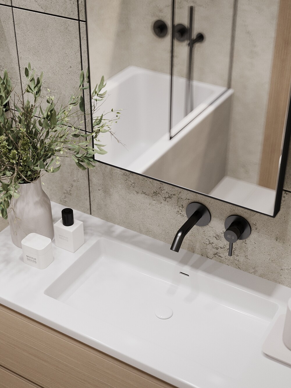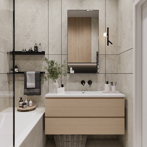 Широкий шов с темной затиркой — превращает обычную раскладку плитки в ванной в декоративное панно.