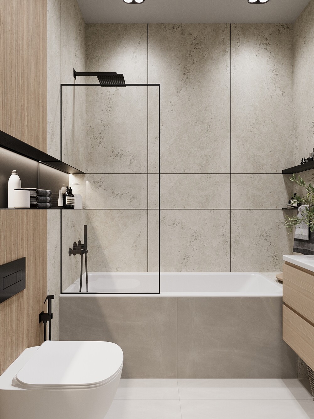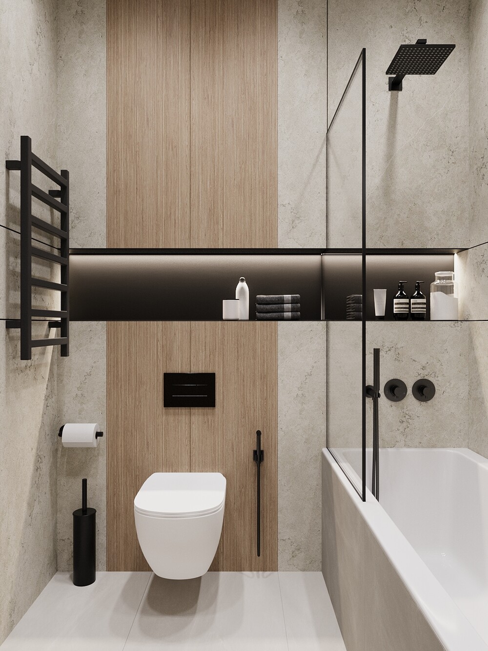 Сантехнику и смесители подобрали в черном матовом цвете, чтобы они выделялись на фоне светлого камня. Тумбу под раковину сделали подвесной, а над ванной предусмотрели ниши с подсветкой для хранения косметики.