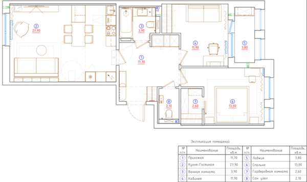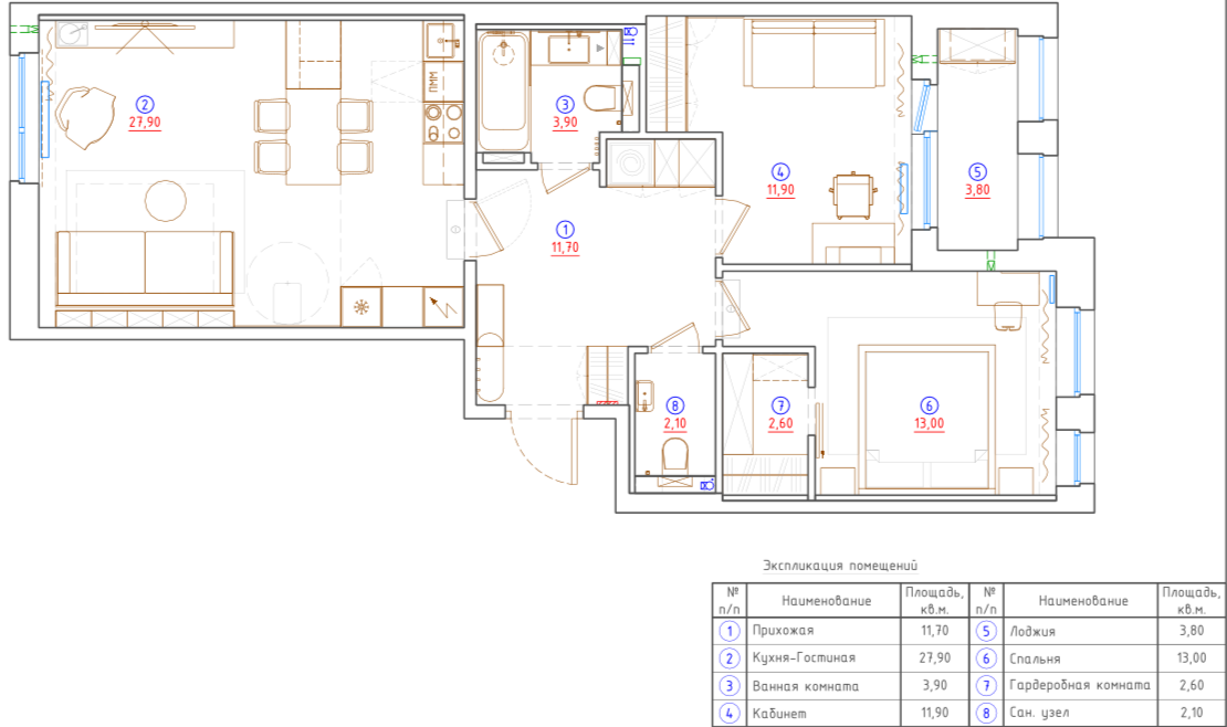 В рамках перепланировки кухню перенесли в пространство бывшей жилой комнаты, объединив её с гостиной. Так появилась открытая зона с островом, обеденной группой и полноценным местом для отдыха. Входную часть пересобрали: часть площади задействовали под хозблок и расширение санузла. Спальню разделили, добавив отдельную гардеробную и встроенное рабочее место. Вторую жилую комнату переосмыслили как кабинет для удалённой работы и редких визитов гостей.