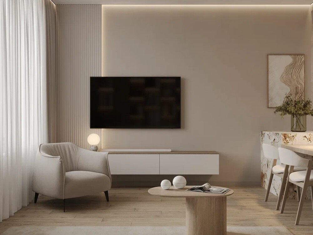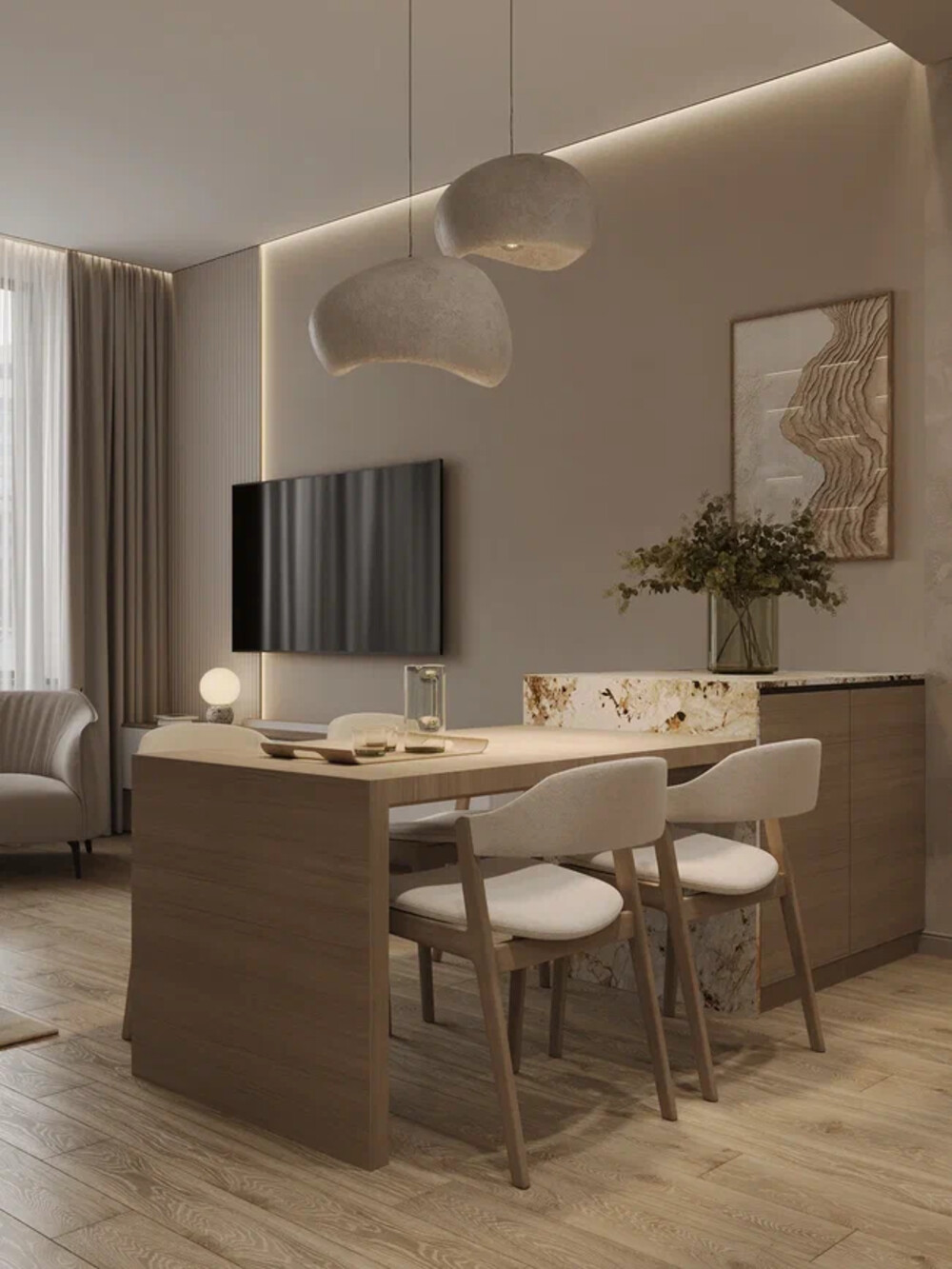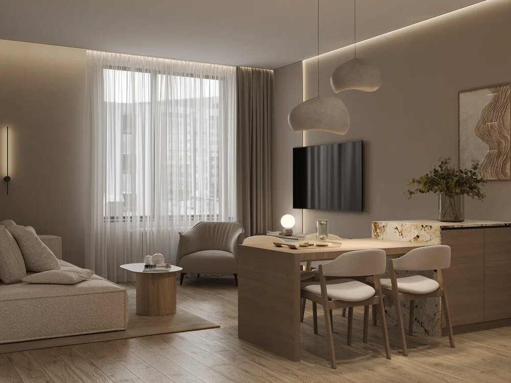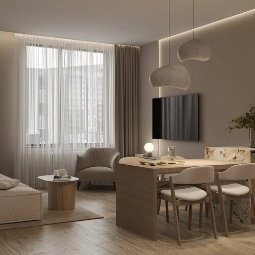 Ремонт квартиры в ЖК «Дефанс» выполнен в современном стиле с элементами джапанди. Цветовая база строится на светлых тёплых оттенках в сочетании с глубокими тёмными акцентами. Такой контраст добавляет выразительности и делает пространство многослойным по восприятию.
