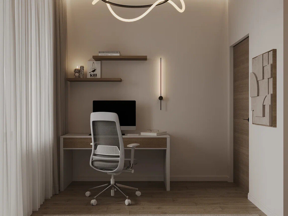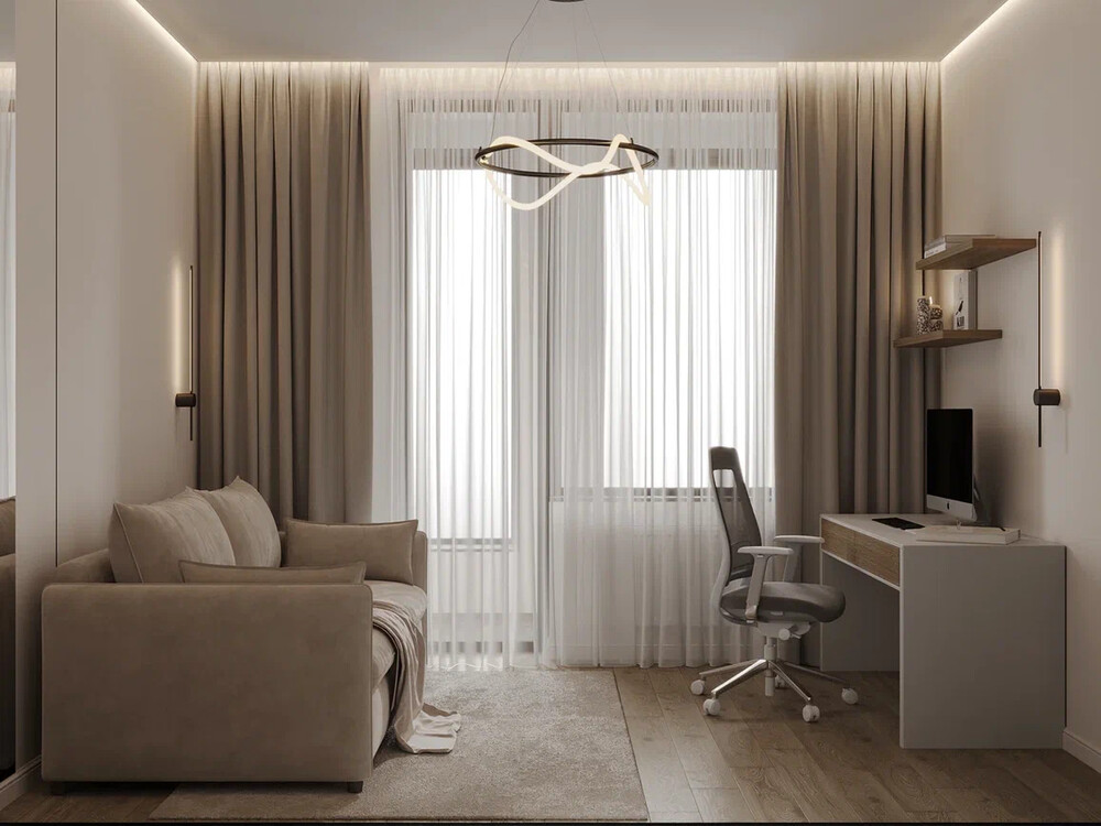 Кабинет спроектирован так, чтобы его можно было изменить: рабочая зона сочетается с диваном-кроватью. Стол у окна и встроенные полки решают вопрос хранения, не перегружая интерьер. Отделка выполнена в светло-серой гамме с акцентом на натуральные фактуры и свет.