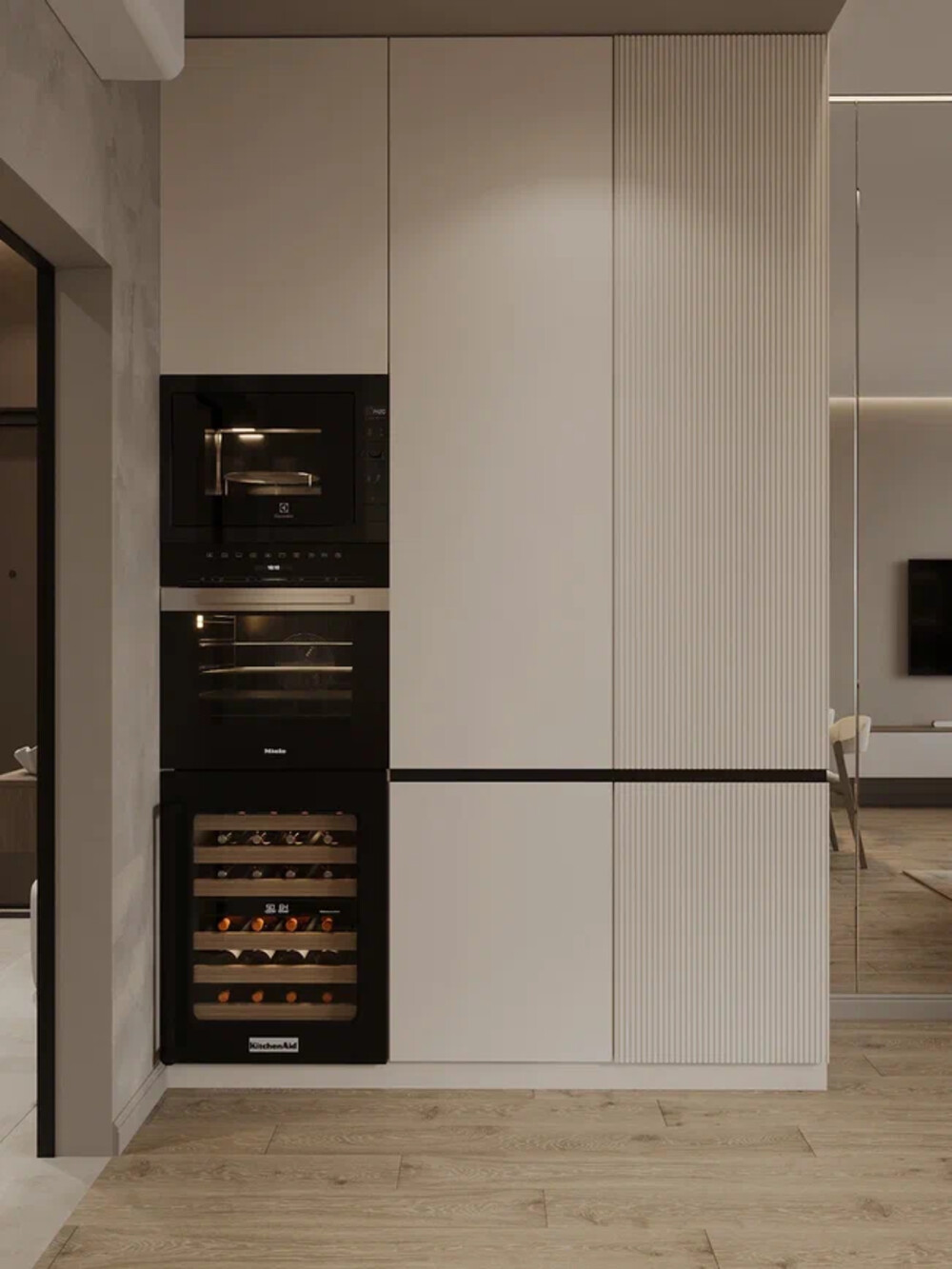 Кухонный блок решён в линейной композиции с параллельно расположенным островом — функциональным и выразительным элементом. Встроенные шкафы и техника интегрированы в плоскость стены, за счёт чего интерьер выглядит цельно. Фактурные поверхности и сдержанная палитра подчёркивают эстетику минимализма.