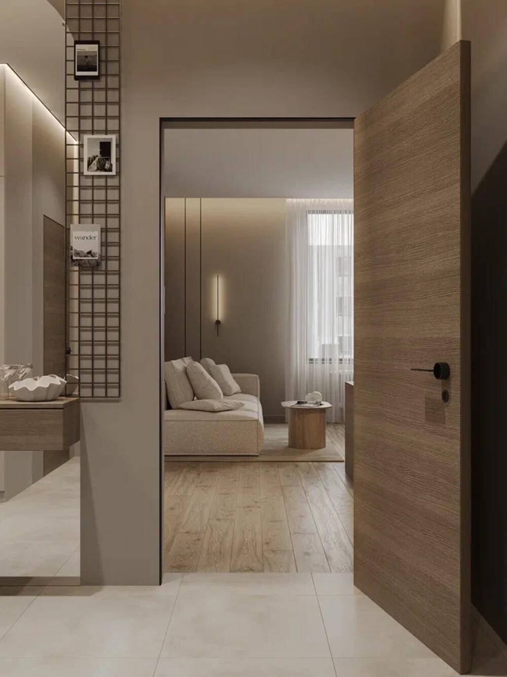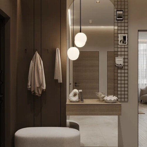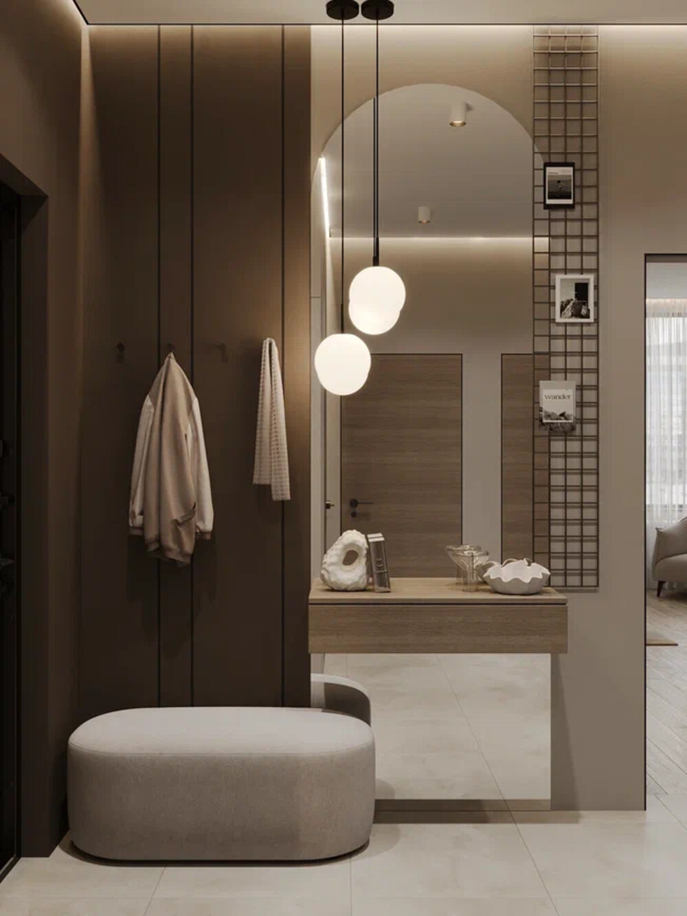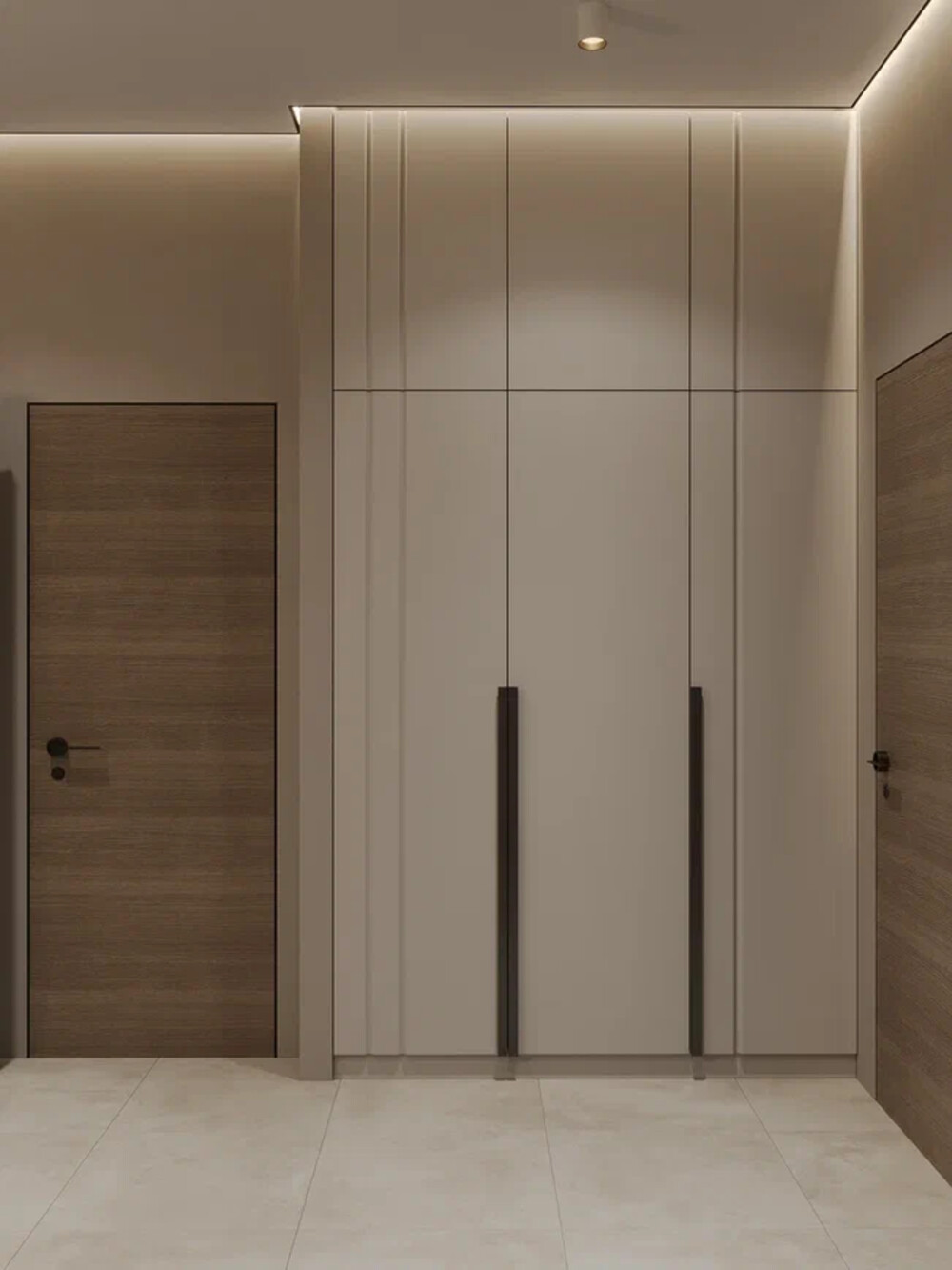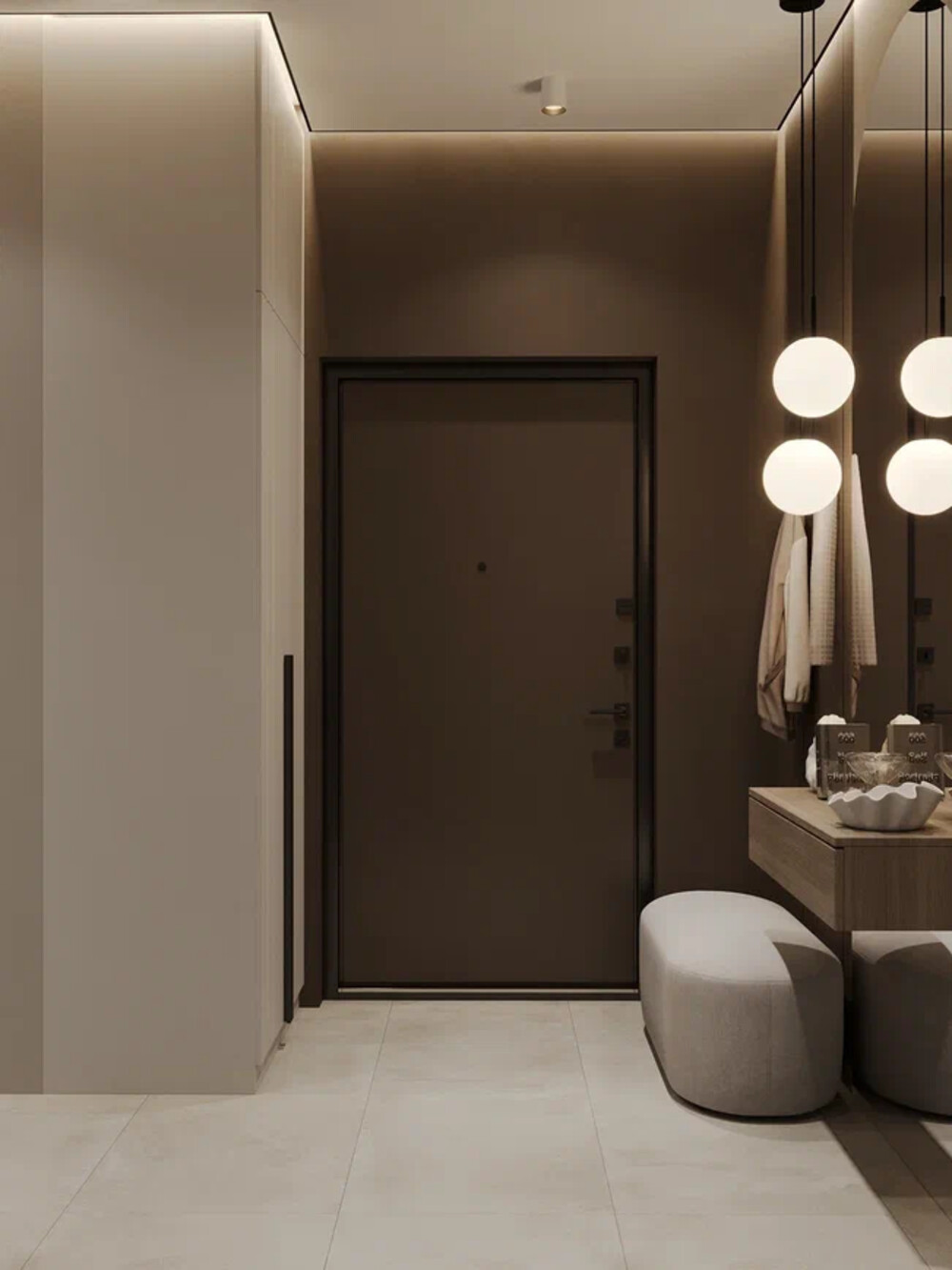 В прихожей — встроенный шкаф, зона хранения техники и визуально лёгкие элементы. Фасады подобраны в тон стен, благодаря чему объёмы воспринимаются цельно. Пуф, консоль и вертикальное зеркало дополняют композицию. Многоуровневый свет помогает зонировать пространство и выделять нужные участки.