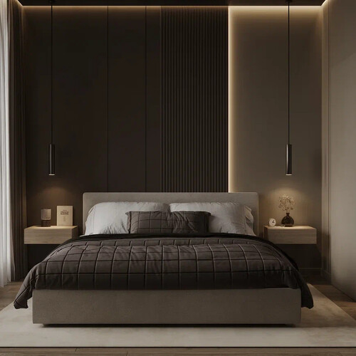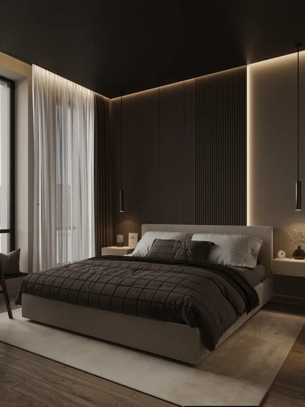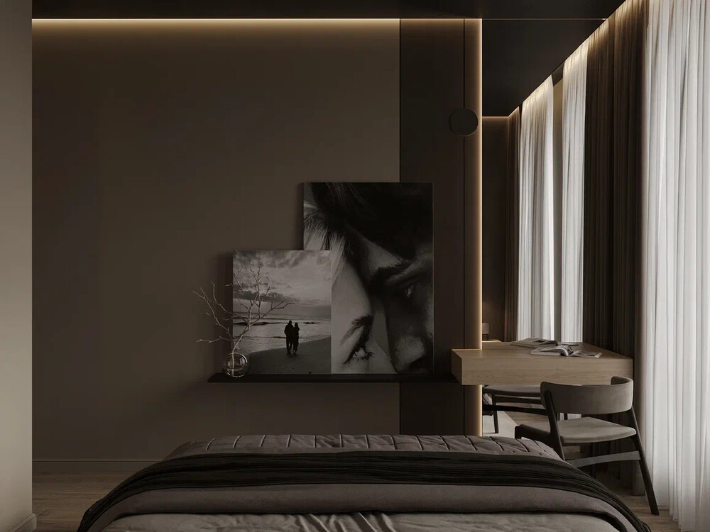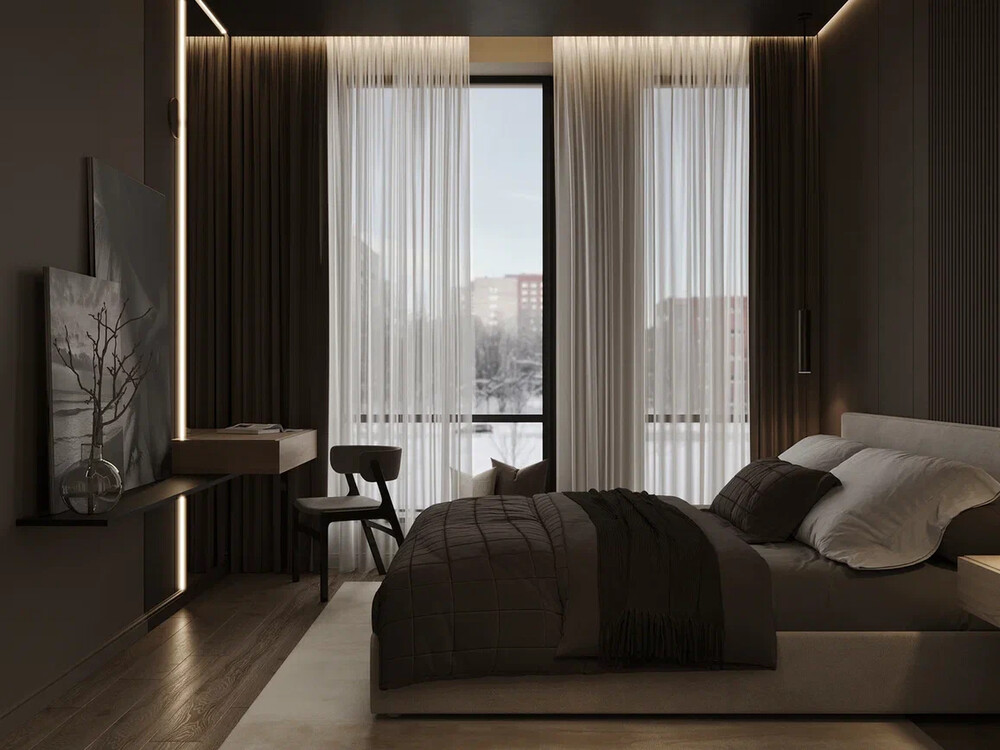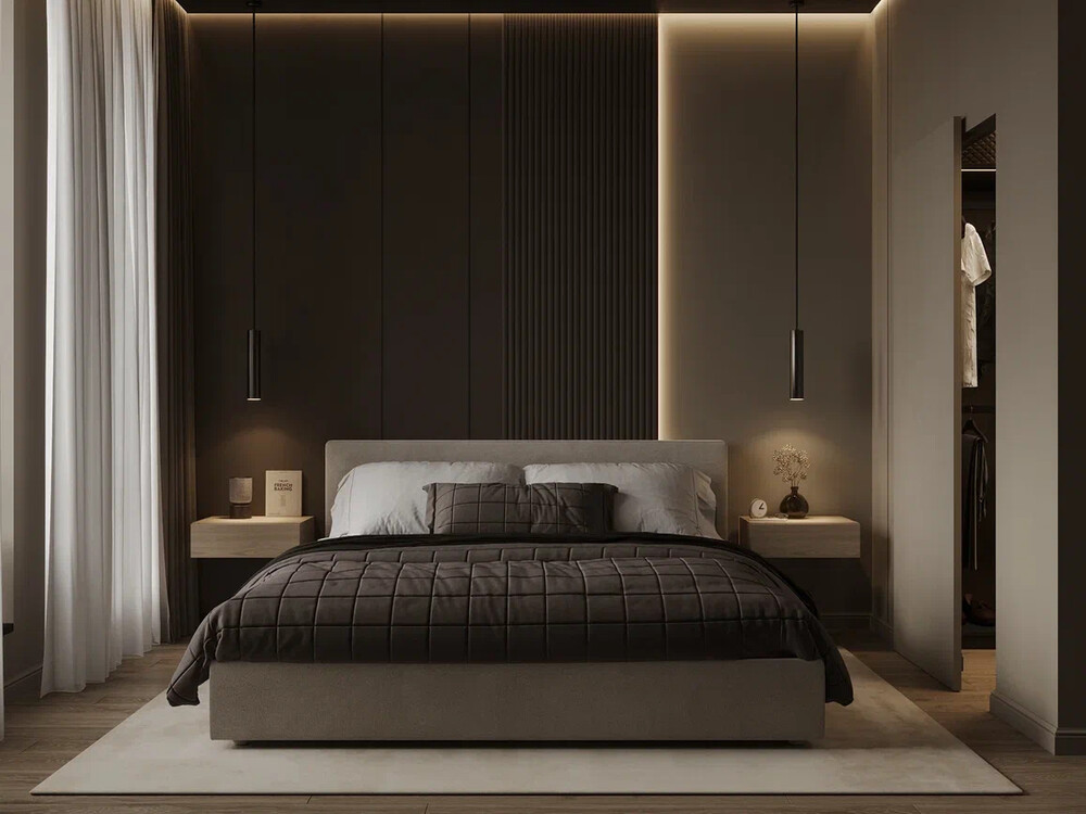 Спальня выполнена в тёмной приглушённой гамме со встроенной подсветкой по периметру, которая добавляет глубины пространству. Изголовье оформлено панелями с древесной текстурой и дополнено подвесными светильниками. У окна организовано рабочее место, встроенное в общую композицию.
