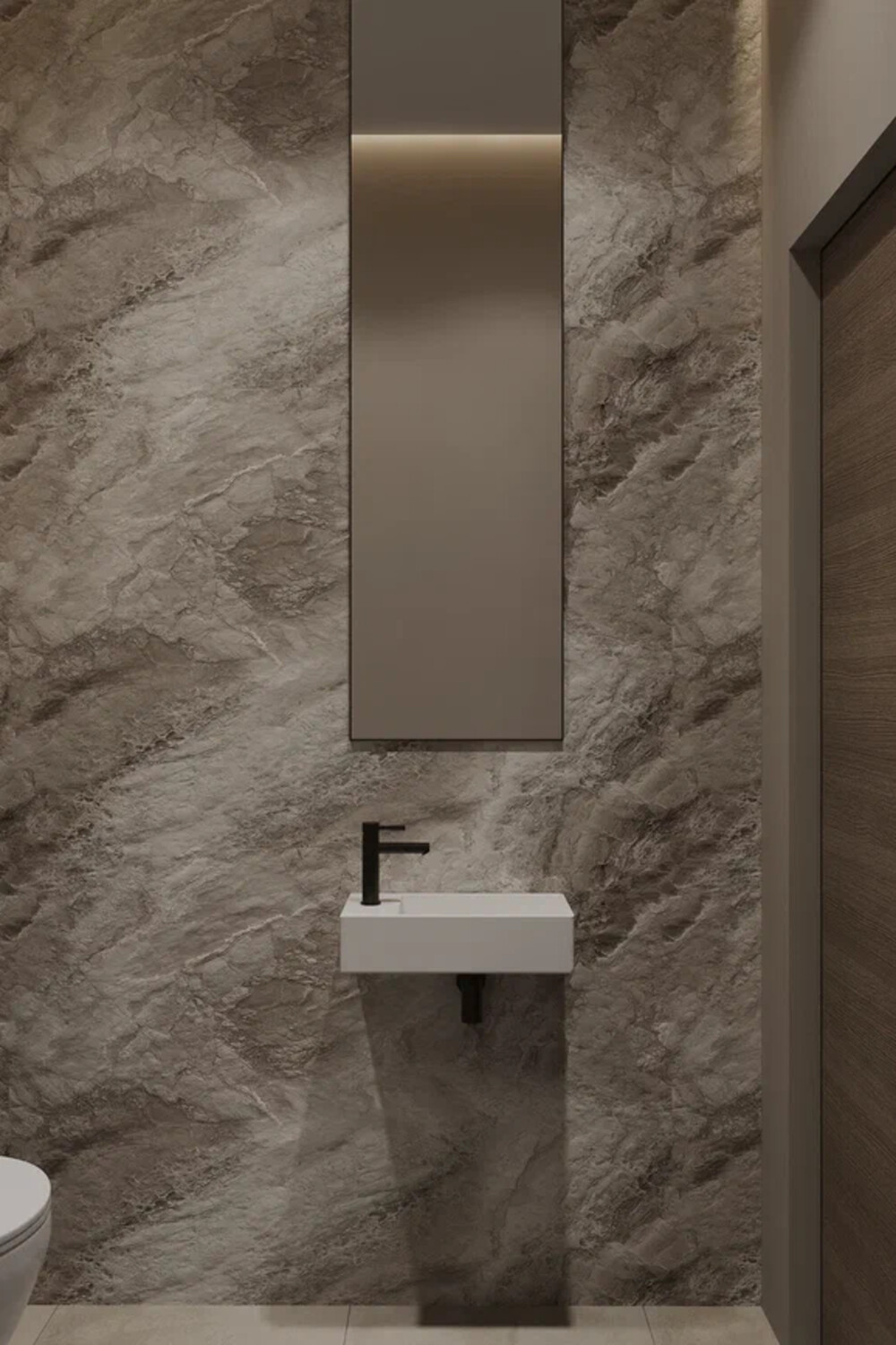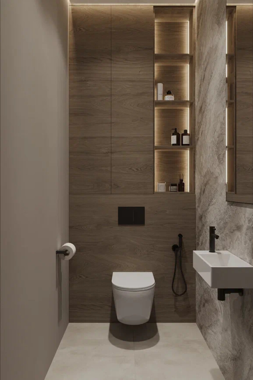 Санузел расширили за счёт перераспределения площади прихожей. Здесь разместили раковину с хранением, подвесной унитаз и вертикальное зеркало с подсветкой. Отделка перекликается с ванной комнатой, поддерживая целостность интерьера. Подсветка в нишах и под мебелью формирует лёгкий световой контур.