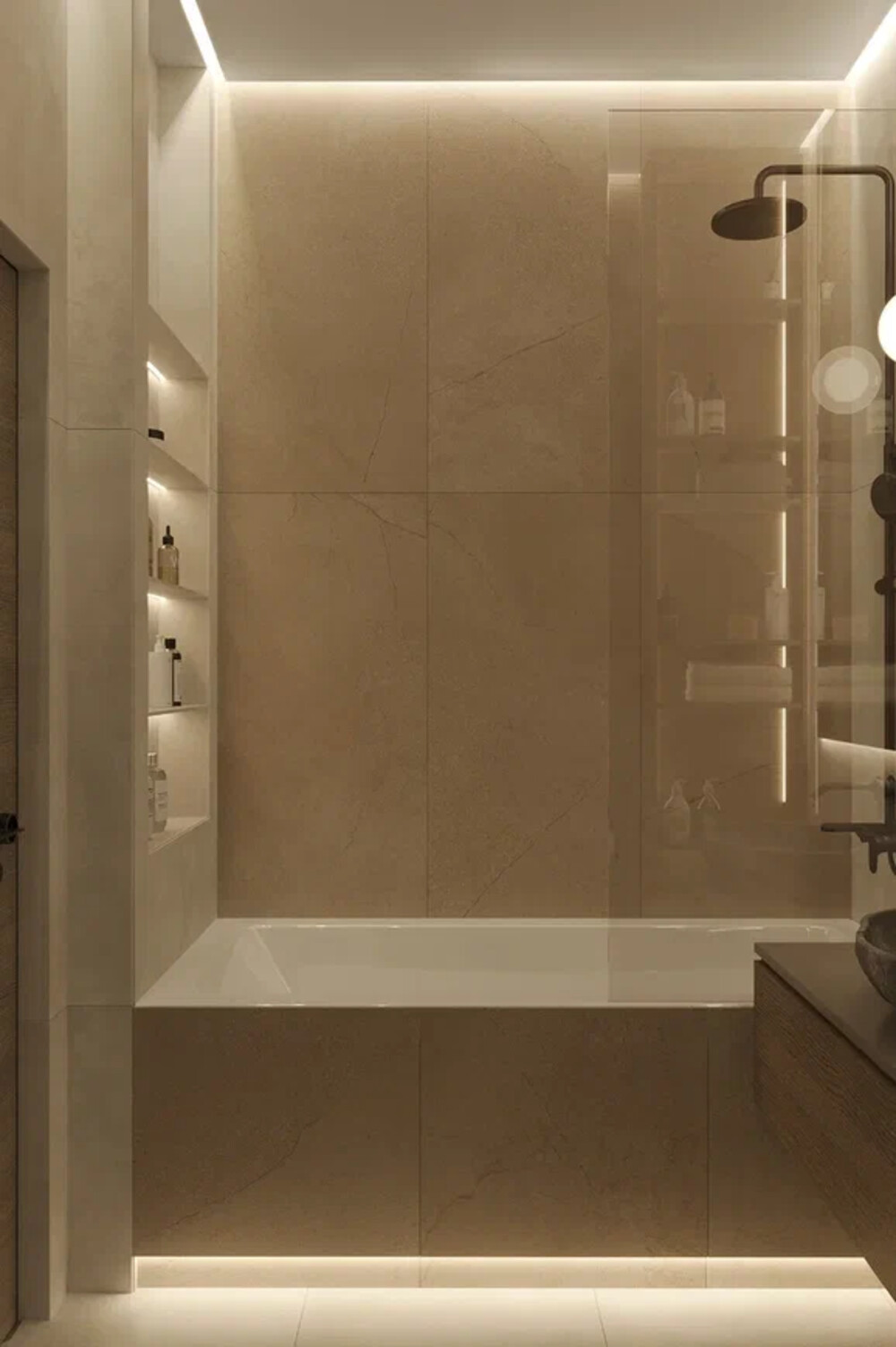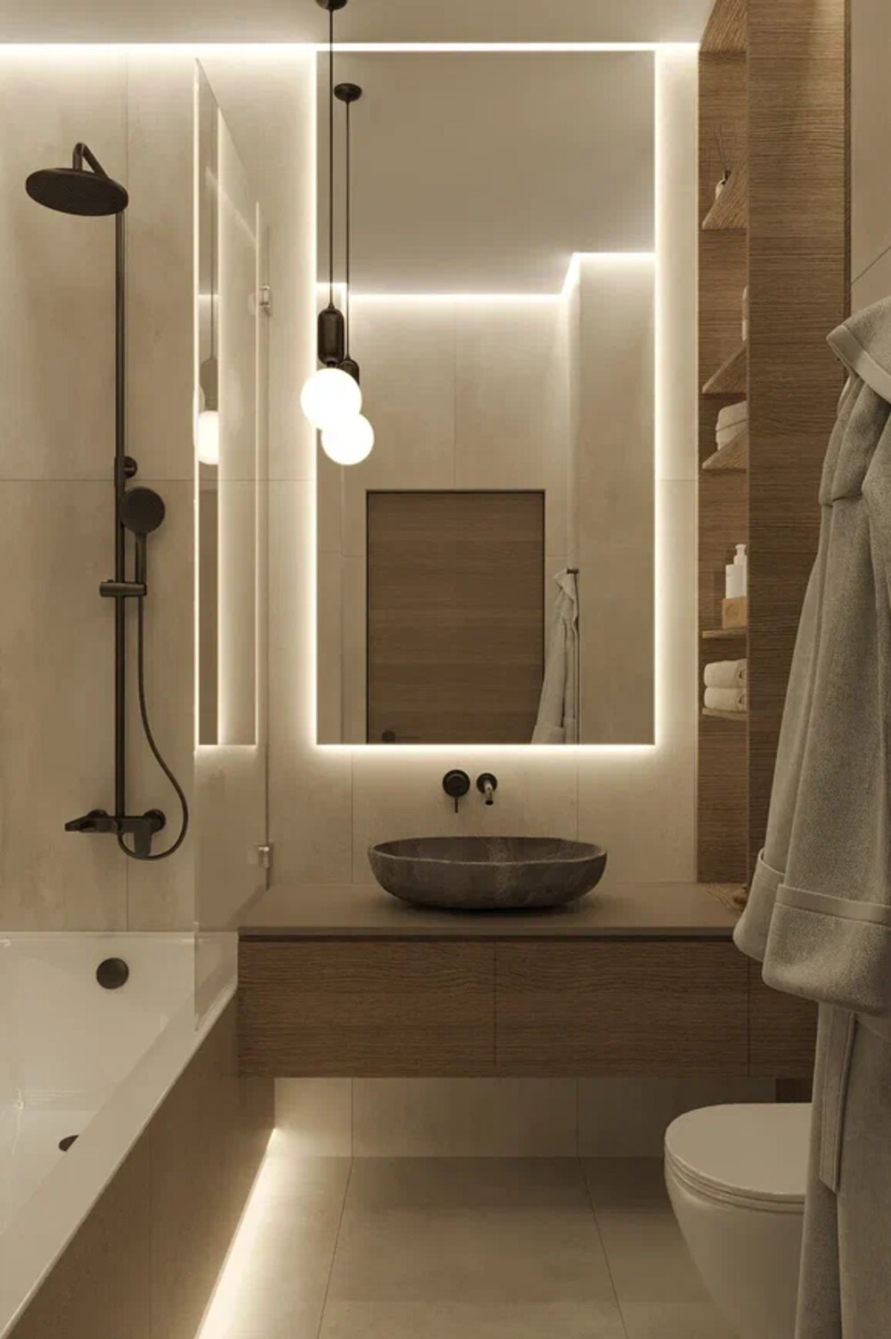 Ванная стала полноценной функциональной зоной: разместили ванну, раковину и системы хранения. В отделке использовано сочетание керамогранита под камень и древесных текстур. Ниши с подсветкой и зеркала с мягким контурным светом визуально расширяют помещение. Матовая чёрная сантехника добавляет графичности и завершает образ.