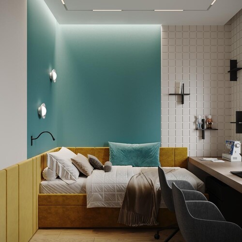 Разноцветные стеклоблоки отделяют кровать от рабочего стола, работая как мягкий световой фильтр и стильный фон для видеосвязи. Желтый каркас кровати контрастирует с оливковыми стенами, украшенными ботаническими принтами.