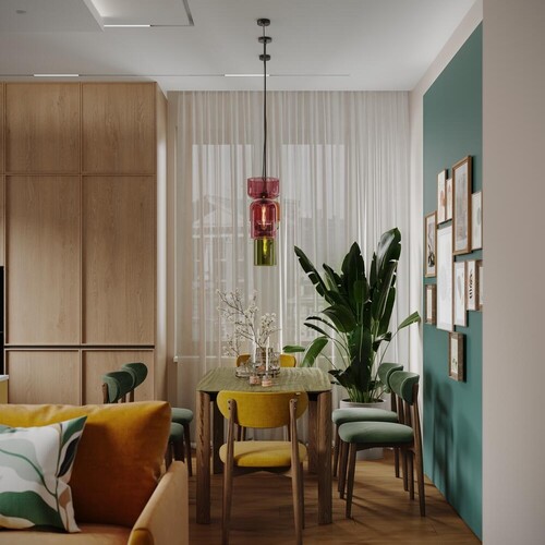 Интерьер реализован в современном стиле с упором на колор-блок и насыщенные природные тона. Основой послужили теплый желтый, оливковый и бирюзовый цвета, которые распределены по зонам в зависимости от их назначения. Оранжевые и терракотовые детали использованы в качестве связующих элементов. Общее пространство выглядит светлым за счет обилия белого цвета в отделке потолков и части стен.