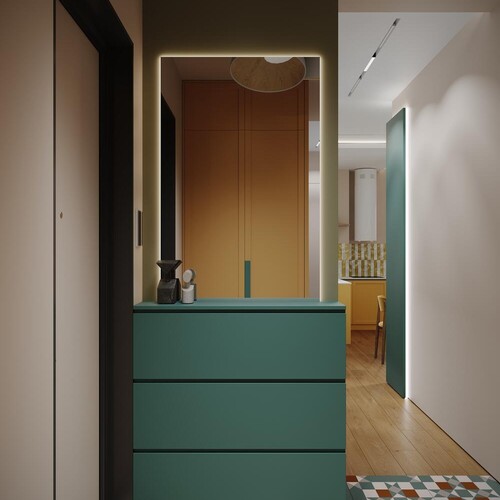 Основной шкаф горчичного цвета полностью скрыт в нише, не выступая за линию стен. Возле входа закрепили зеркальное полотно в пол и установили компактную бирюзовую обувницу.