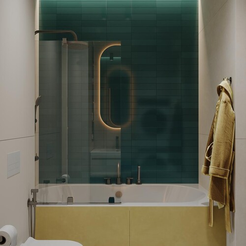 Второй санузел получил необычную деталь — в нижней части терракотовой тумбы предусмотрели специальный лаз для кошек. Стена за инсталляцией выделена бледно-желтой плиткой, теплоту которой подчеркивает встроенная в полки подсветка.