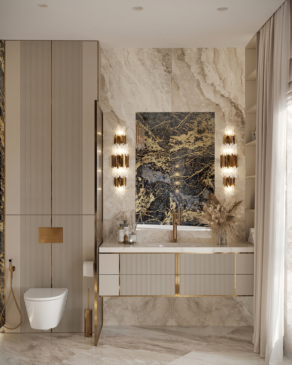 Функциональная зона умывальника дополнена подвесной тумбой с рифлеными фасадами и парой симметричных бра в золотом корпусе. Завершает интерьер массивная каскадная люстра, которая вместе с латунными смесителями и деталями мебели создает единый металлической код проекта.