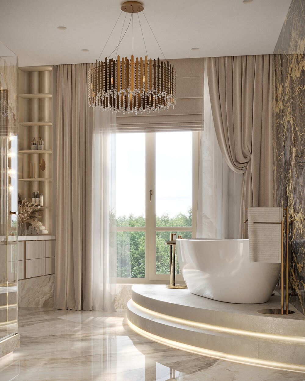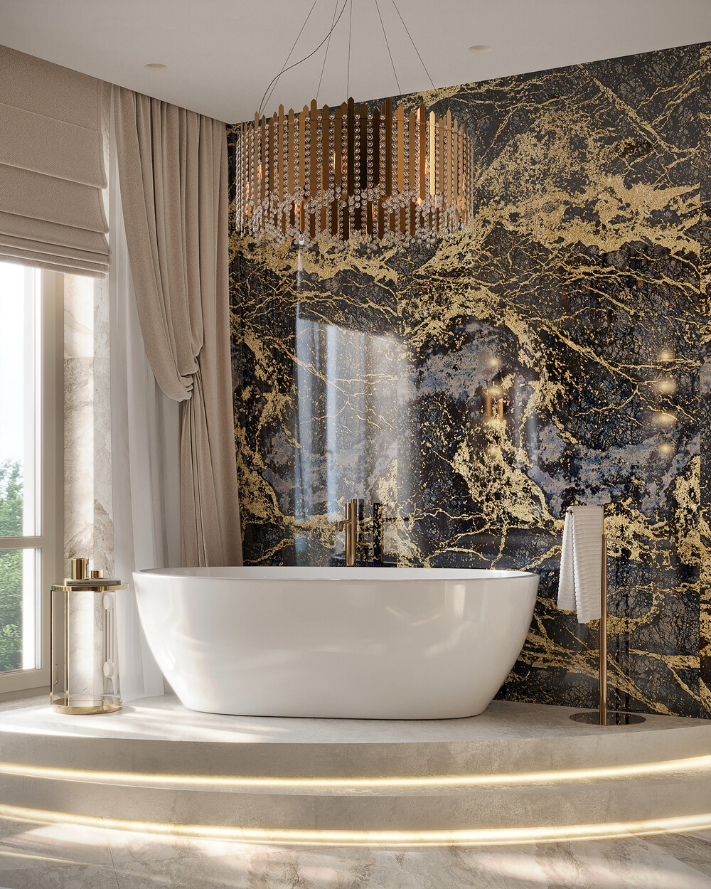 Центром пространства стала отдельно стоящая чаша на радиусном подиуме с контурной подсветкой, расположенная прямо у панорамного окна. Основную стену и зону душевой оформили акцентным темным камнем с активными золотыми жилами.